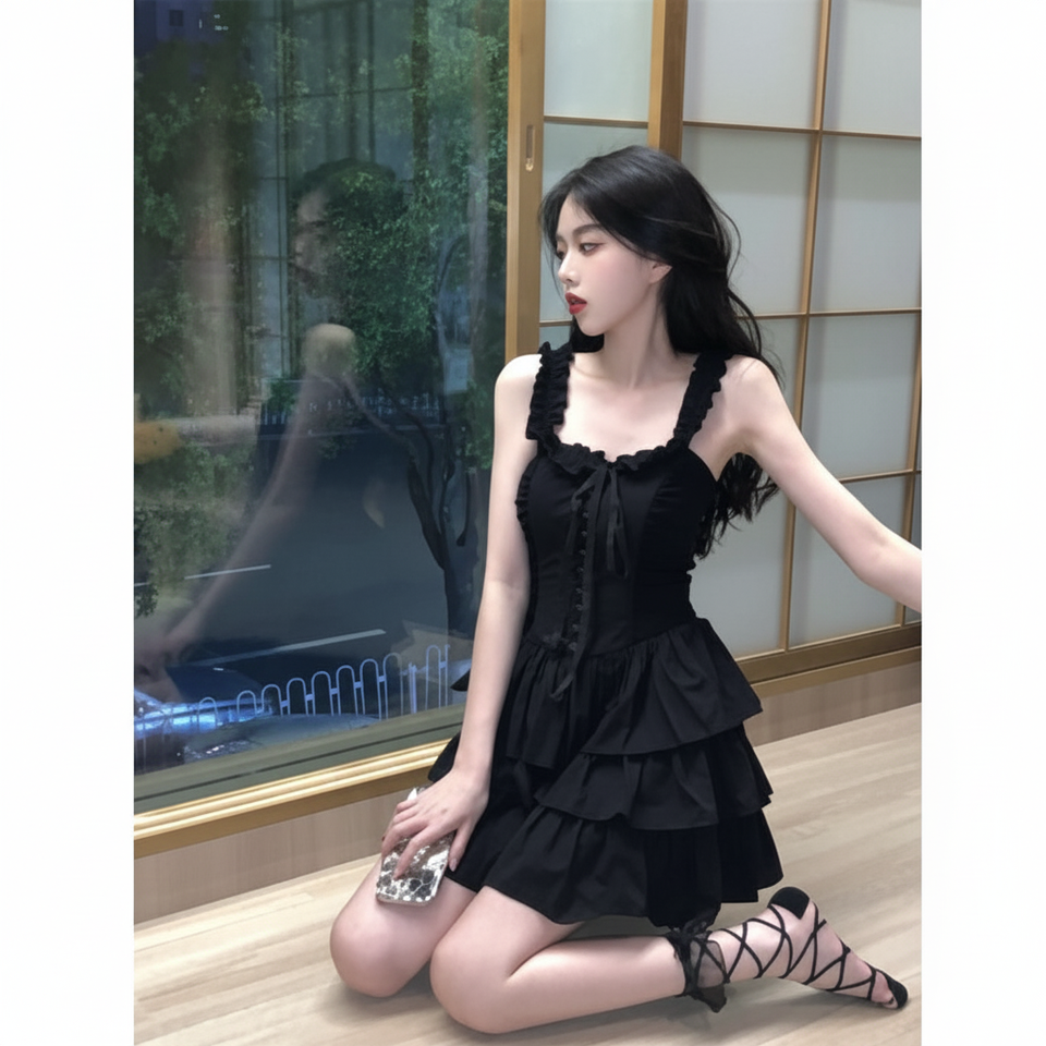 เดรสกระโปรงแต่งระบายเซ็กซี่สำหรับผู้หญิงชุดเดรสสายเดี่ยวสไตล์ฝรั่งเศส