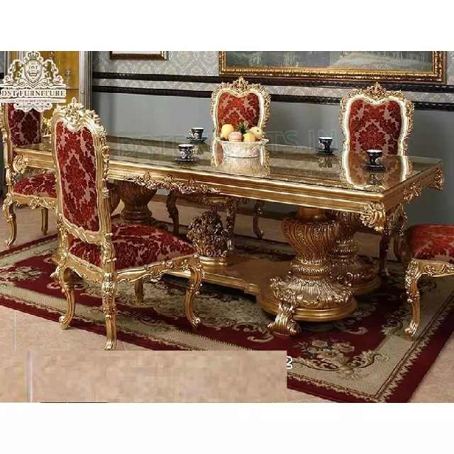 ชุดโต๊ะอาหารทับทิมสีแดง6ที่นั่งสไตล์ฝรั่งเศส,โต๊ะรับประทานอาหารงานหัตถกรรมสีทองหรูหราพร้อมเก้าอี้การออกแบบอิมพีเรียลไม้สัก