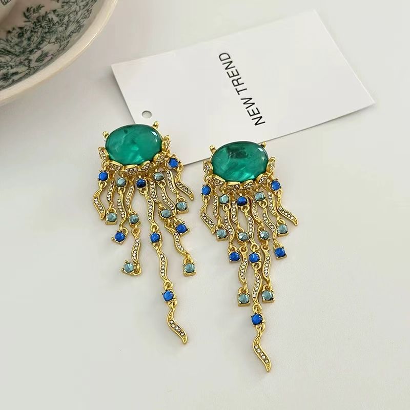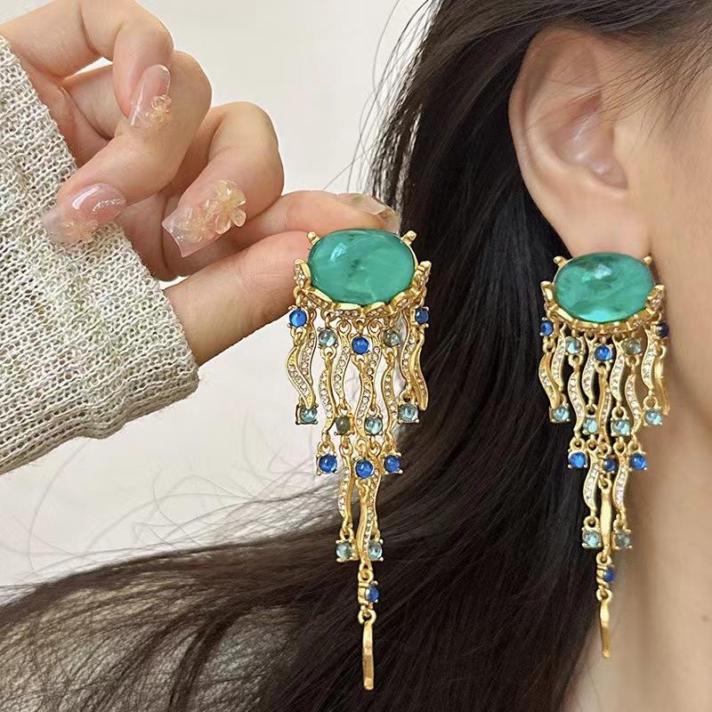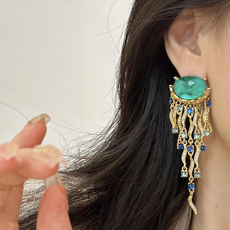 ต่างหูสไตล์ศาลสไตล์ฝรั่งเศสต่างหูหินสีเขียวยาวแบบห้อยสำหรับงานเลี้ยง