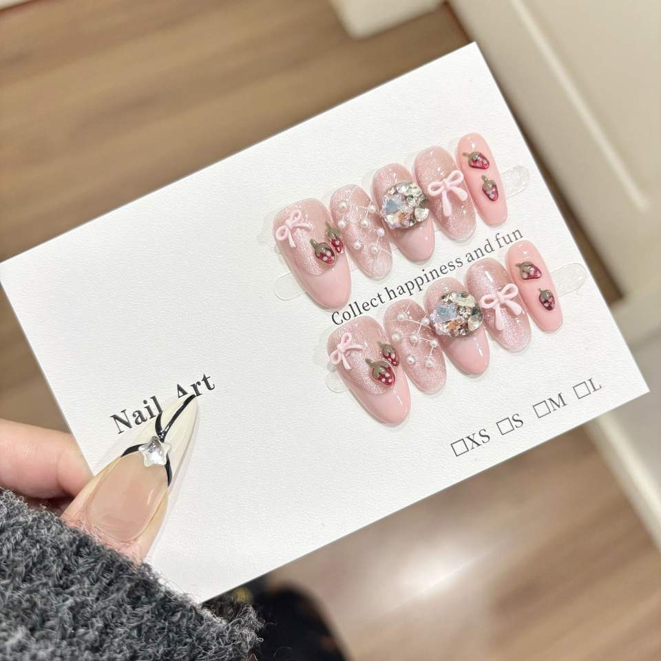 เล็บปลอมแบบกดติดสไตล์ฝรั่งเศส น่ารัก ทำมือ ลายสตรอว์เบอร์รี่พาย สีชมพูสดใส ดีไซน์ตาแมว สติ๊กเกอร์ติดเล็บ