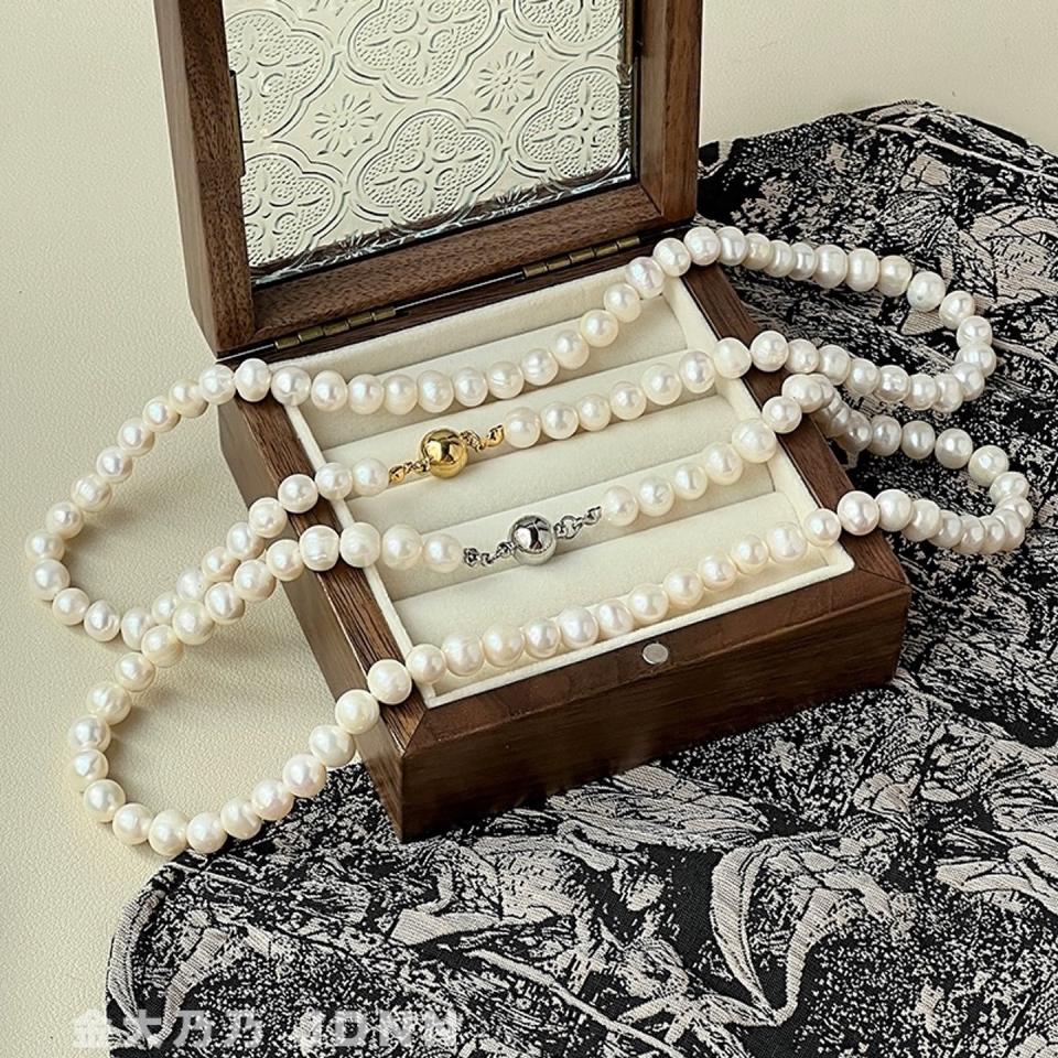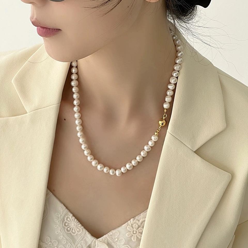 สร้อยคอมุกน้ำจืดสไตล์ฝรั่งเศส พร้อมด้ายธรรมชาติและตัวล็อคแม่เหล็ก ให้ความรู้สึกหรูหราด้วยเสน่ห์ของสร้อยคอประดับกระดูกไหปลาร้า