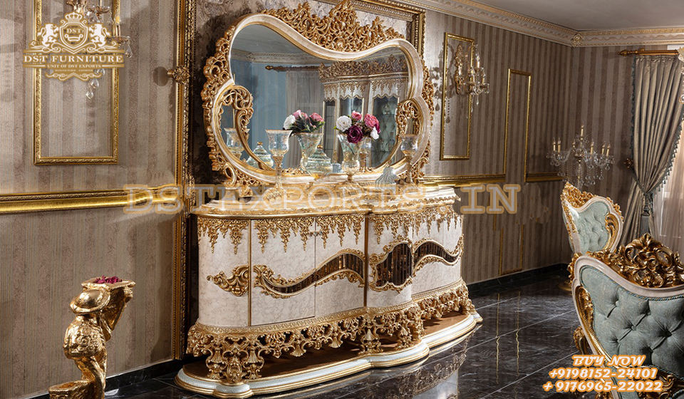 French Style Hand Carved Modern Teak Wood Dining Room Furniture Set Heavy Carved Luxurious Golden Dining Table