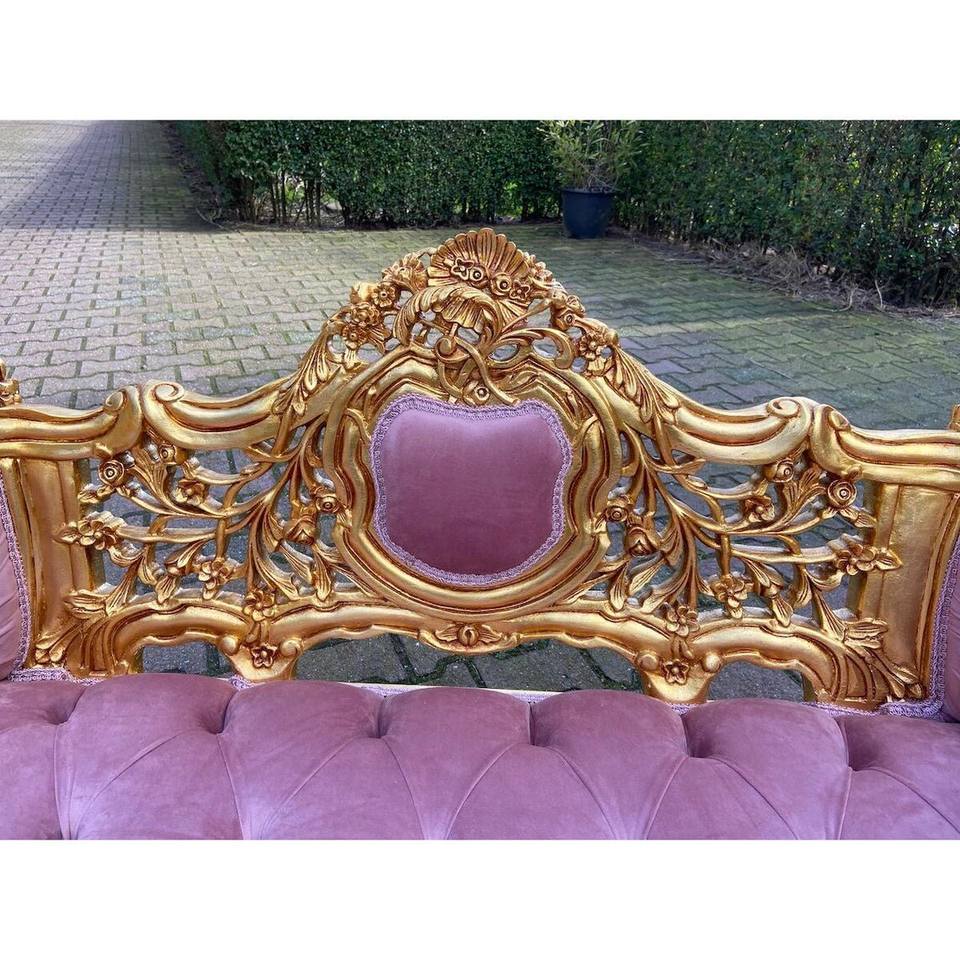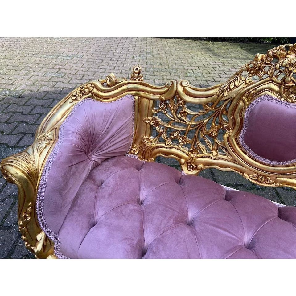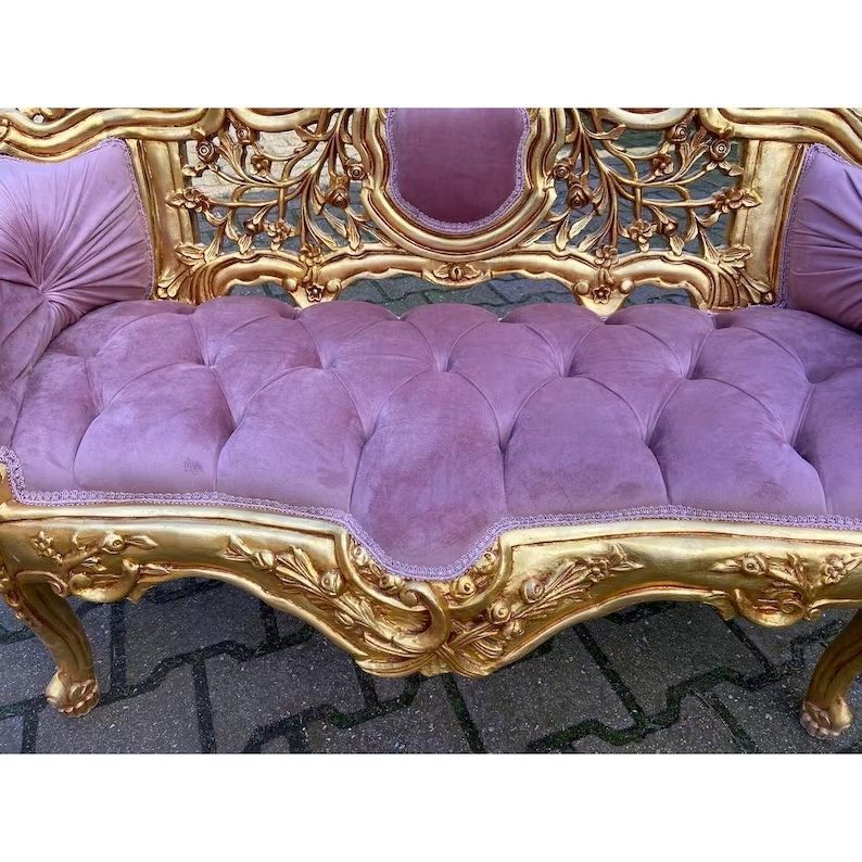 โซฟาลาโทยาสไตล์ฝรั่งเศส ทำจากไม้มะฮอกกานีคุณภาพดี หุ้มกำมะหยี่สีชมพู ขาสีทอง สำหรับใช้ภายในอาคาร