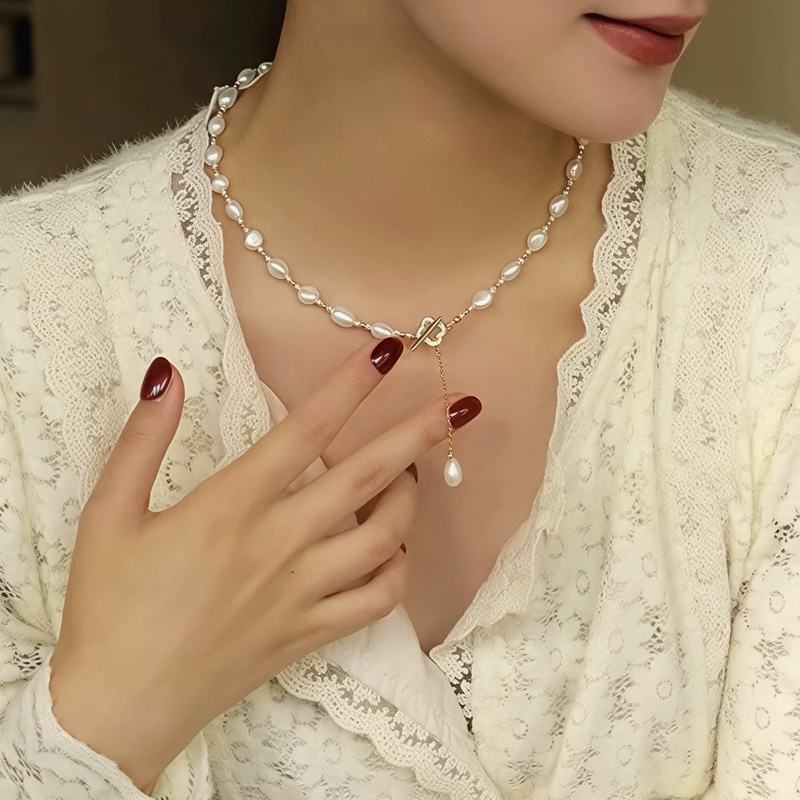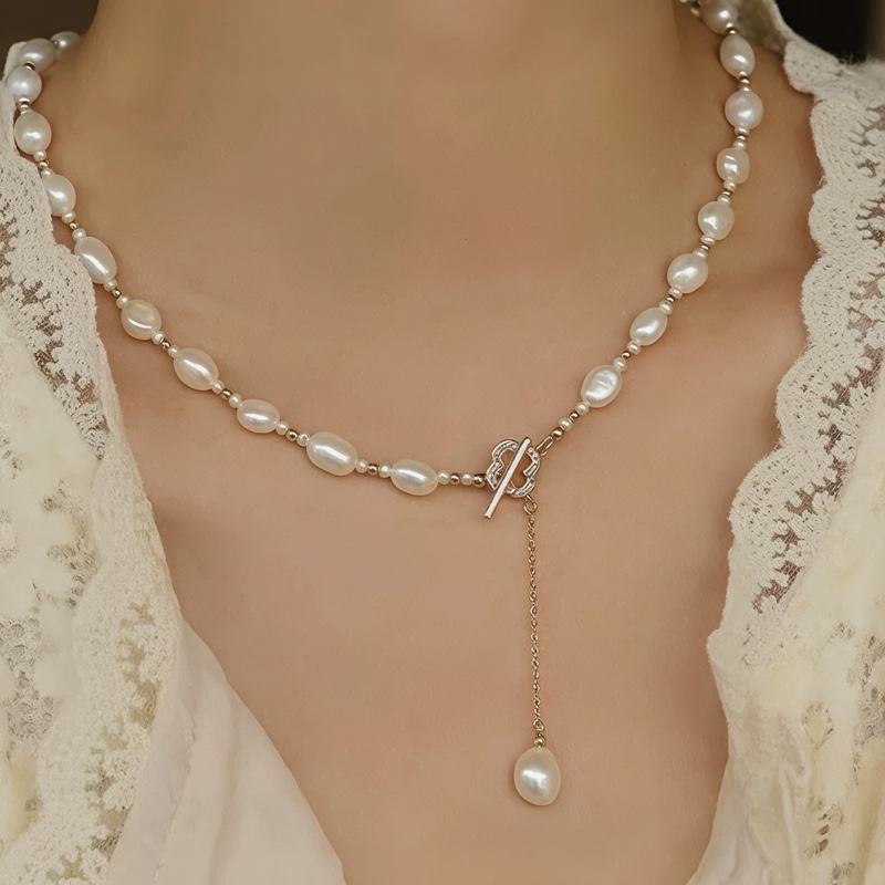 สร้อยคอจี้ไข่มุกทรงธรรมชาติ สไตล์ฝรั่งเศส หรูหราเบาๆ สำหรับผู้หญิง แฟชั่นฤดูใบไม้ผลิ ฤดูร้อน รูปทรงตัว Y ใบโคลเวอร์สี่แฉก