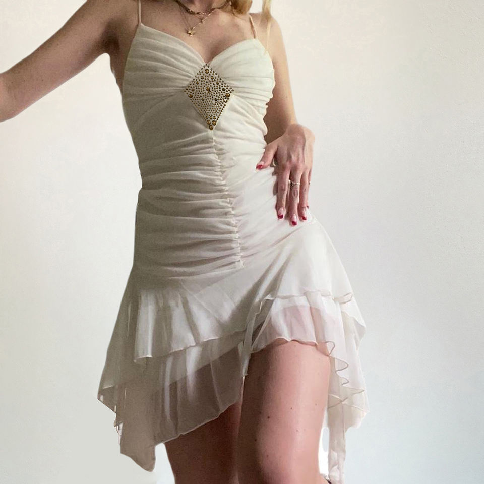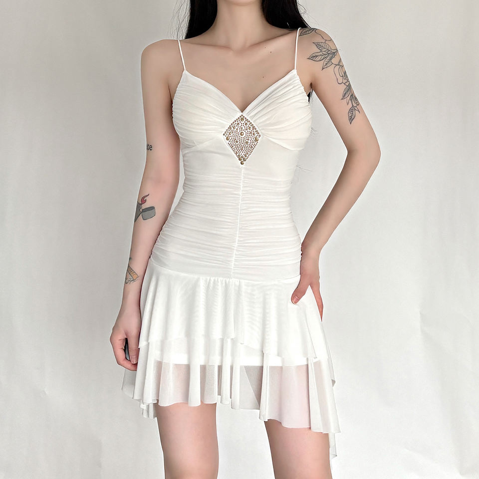 ชุดเดรสสไตล์ฝรั่งเศสสำหรับผู้หญิง ดีไซน์ระบายประดับเพชร ลายปักแบบมีเลเยอร์ ชายกระโปรงไม่สมมาตร ชุดเดรสฤดูร้อนแสนหวาน