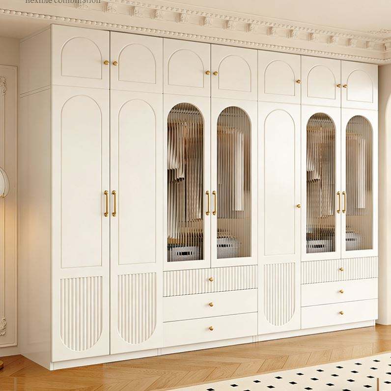 ตู้เสื้อผ้าสไตล์ฝรั่งเศสสีขาวเคลือบเงา พร้อมประตูกระจกแบบโปร่งลายคลื่น ลิ้นชักกระจก และดีไซน์ด้านข้างโค้ง