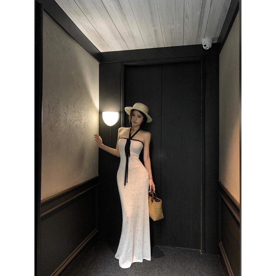เดรสยาวสีขาวสไตล์ฝรั่งเศส สายคล้องคอ ไร้สายรัดเอว ทรงเข้ารูป เปิดหลัง ระบายอากาศได้ดี เหมาะสำหรับใส่ไปเที่ยวทะเล ชุดคลุมสำหรับผู้หญิง ฤดูร้อน 2025