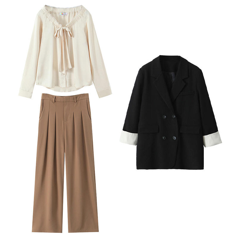 ชุดสูทผู้หญิงสไตล์ฝรั่งเศสพร้อมเสื้อชีฟองสีขาวกางเกงสีกากีเสื้อแจ็คเก็ตสีดำ N9313 การออกแบบการต่อผ้าสีทึบ