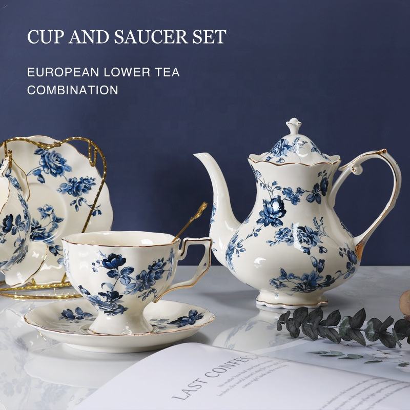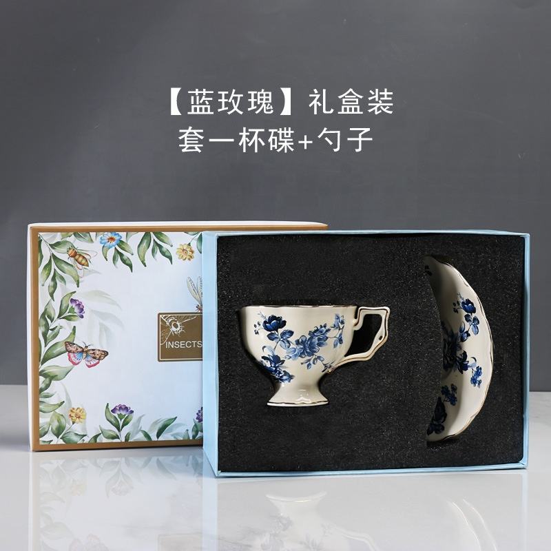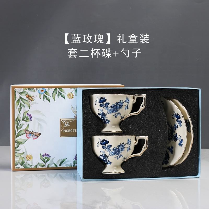 ชุดแก้วกาแฟเซรามิกสีฟ้าและจานรองพอร์ซเลนพร้อมที่จับสำหรับใช้ในบ้านอุปกรณ์ดื่มที่สมบูรณ์แบบสไตล์วินเทจฝรั่งเศส