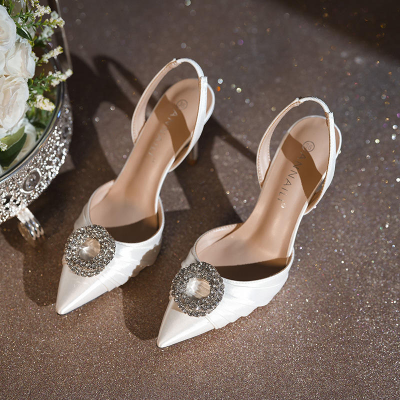 รองเท้าส้นสูงแบบฝรั่งเศสประดับเพชรปลายแหลมสำหรับผู้หญิง ผ้าซาตินสีขาว เหมาะสำหรับงานแต่งงานฤดูร้อน รองเท้าเพื่อนเจ้าสาว