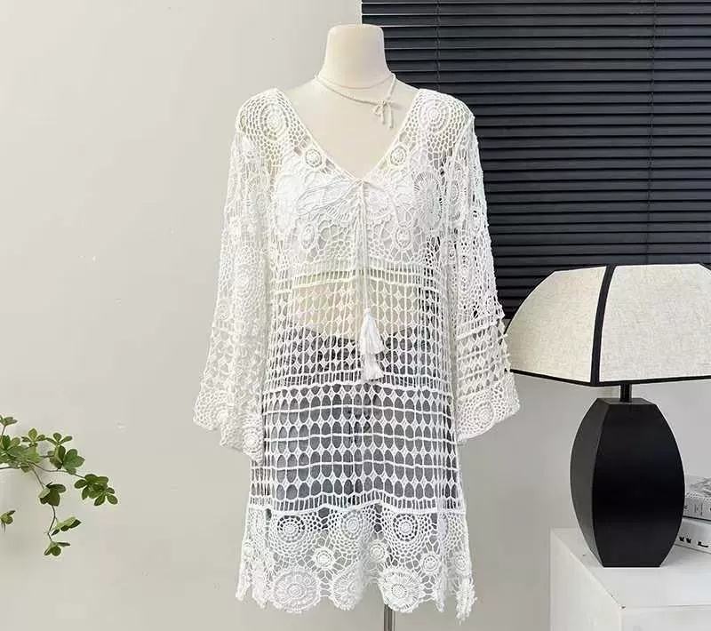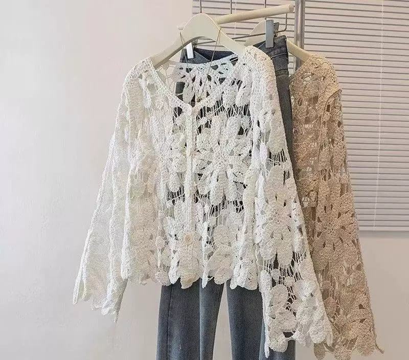 เสื้อคาร์ดิแกนถักโครเชต์สไตล์ฝรั่งเศส งานหนัก ดีไซน์ย้อนยุค คอวี แต่งลูกไม้ปักลายฉลุ ป้องกันแสงแดด สำหรับผู้หญิง