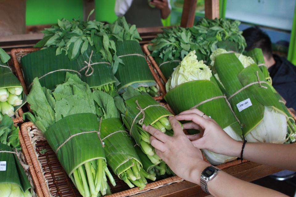 ใบตองสดทั้งหมดสำหรับบรรจุผักในตลาดสุดพิเศษใบตองสีเขียวสำหรับห่ออาหาร