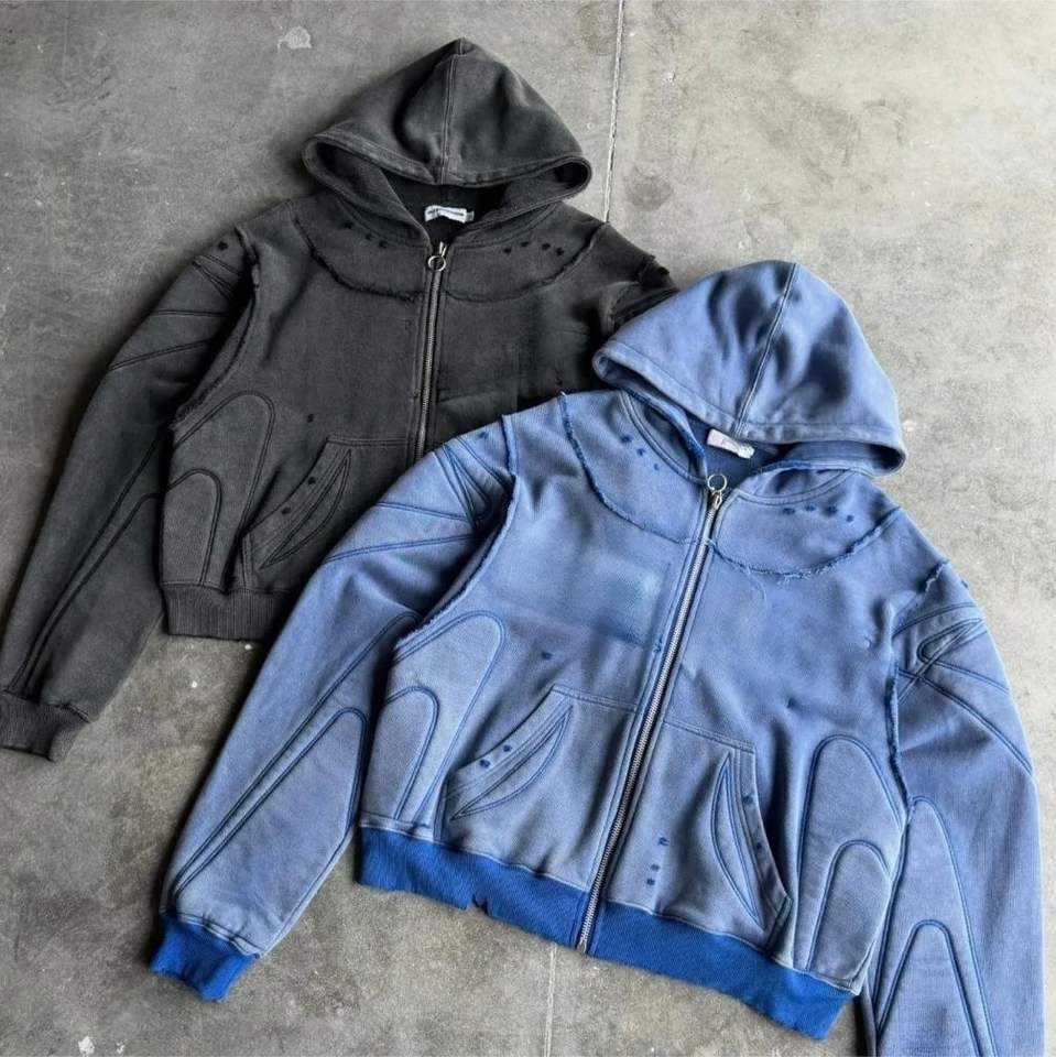 เสื้อมีฮู้ดปักไหล่และซิปสำหรับผู้ชายเสื้อสเวตเชิ้ตสีน้ำตาลโอเวอร์ไซส์สไตล์สดใส