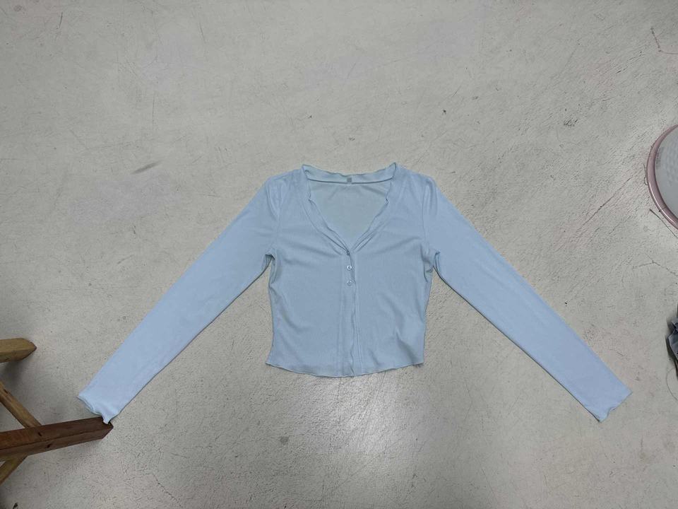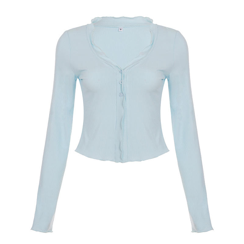 เสื้อยืดถักนิตติ้งทรงพอดีตัว คอวี แขนยาว ติดกระดุมสามเม็ด ชายเสื้อระบาย สีพื้น ระบายอากาศได้ดี สไตล์หวานสดใส สำหรับผู้หญิง
