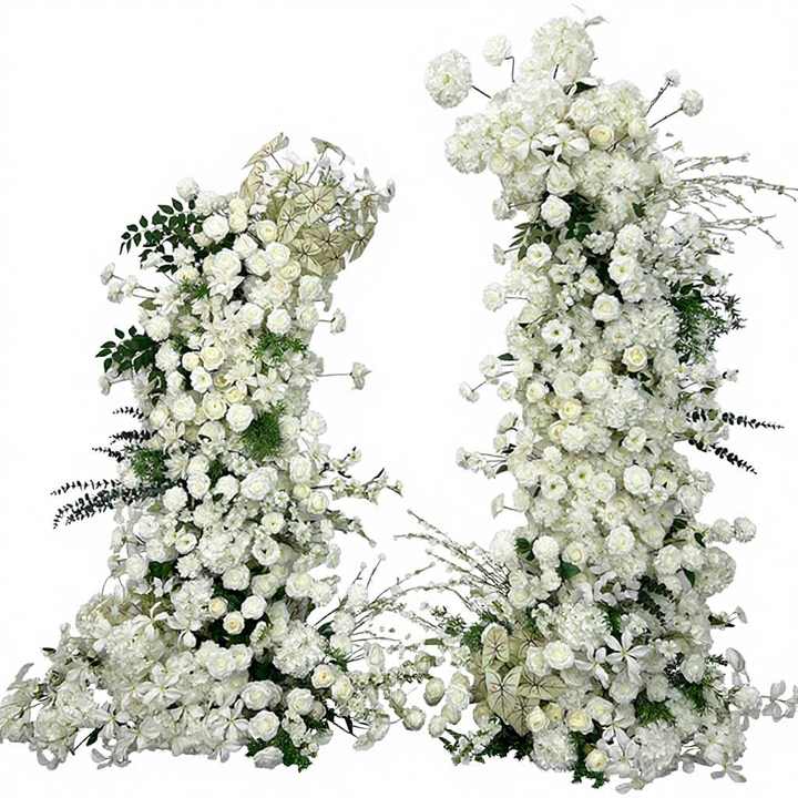 ดอกไม้ประดิษฐ์สีขาวสดและซุ้มพืชสีเขียวใช้สำหรับตกแต่งโต๊ะและจัดงานแต่งงาน