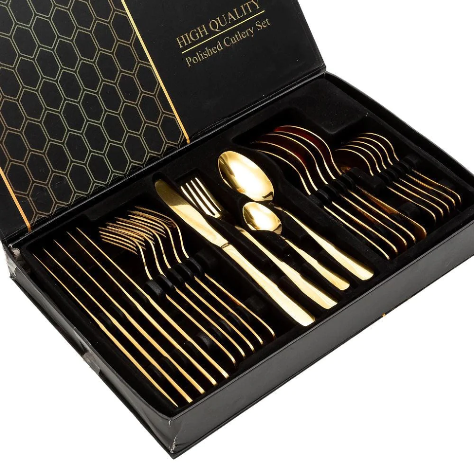 ชุดช้อนส้อมรับประทานอาหารสีทองสำหรับร้านอาหารเครื่องใช้บนโต๊ะอาหารสำหรับโรงแรมดีไซน์ใหม่