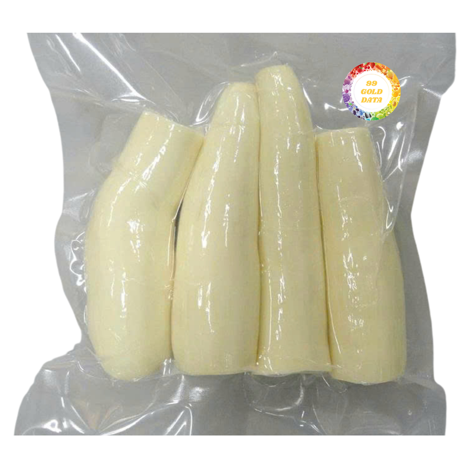 ตัดมันสำปะหลังสดแช่แข็งและปอกเปลือกพร้อมสำหรับการเตรียมอาหารเย็นอย่างรวดเร็ว