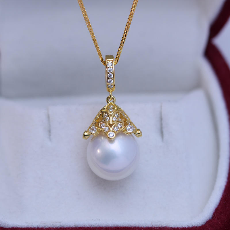 สร้อยคอจี้มุกน้ำจืดทรงกลมสีขาวขนาด 11-12 มม. สำหรับผู้หญิง เงินแท้ S925 พร้อมเข็มกลัดโบว์ แสงเงาสวยงาม มีตำหนิเล็กน้อย