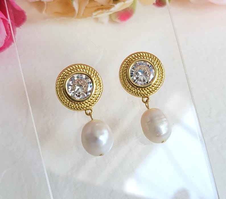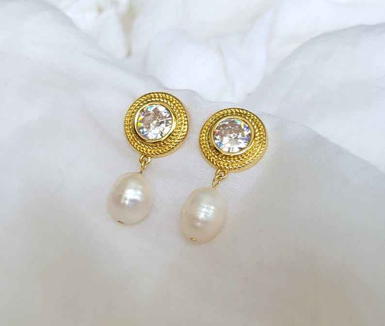 ต่างหูไข่มุกน้ำจืดพร้อมต่างหูเม็ดกลม CZ สำหรับเจ้าสาวชุบทอง14K 925เงินสเตอร์ลิง