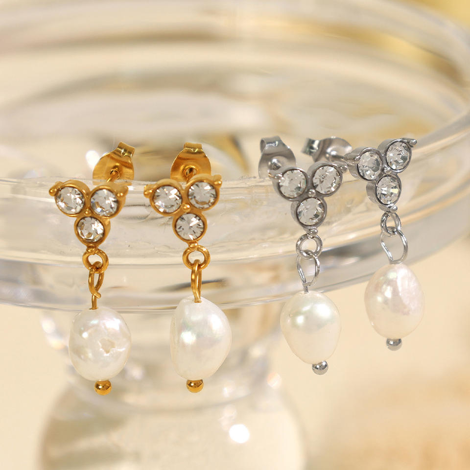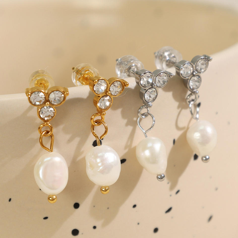 ต่างหูมุกน้ำจืดประดับเพชรสามเม็ดสำหรับผู้หญิง ไทเทเนียมสตีล ชุบทอง 18k สำหรับใส่ทุกวัน ดีไซน์ทรงเรขาคณิต