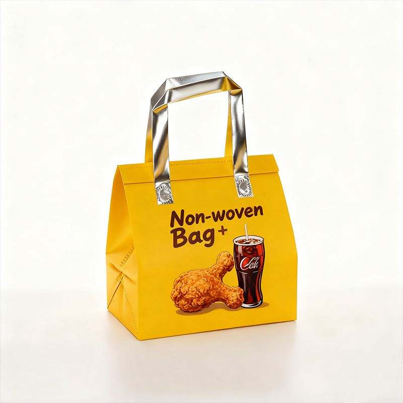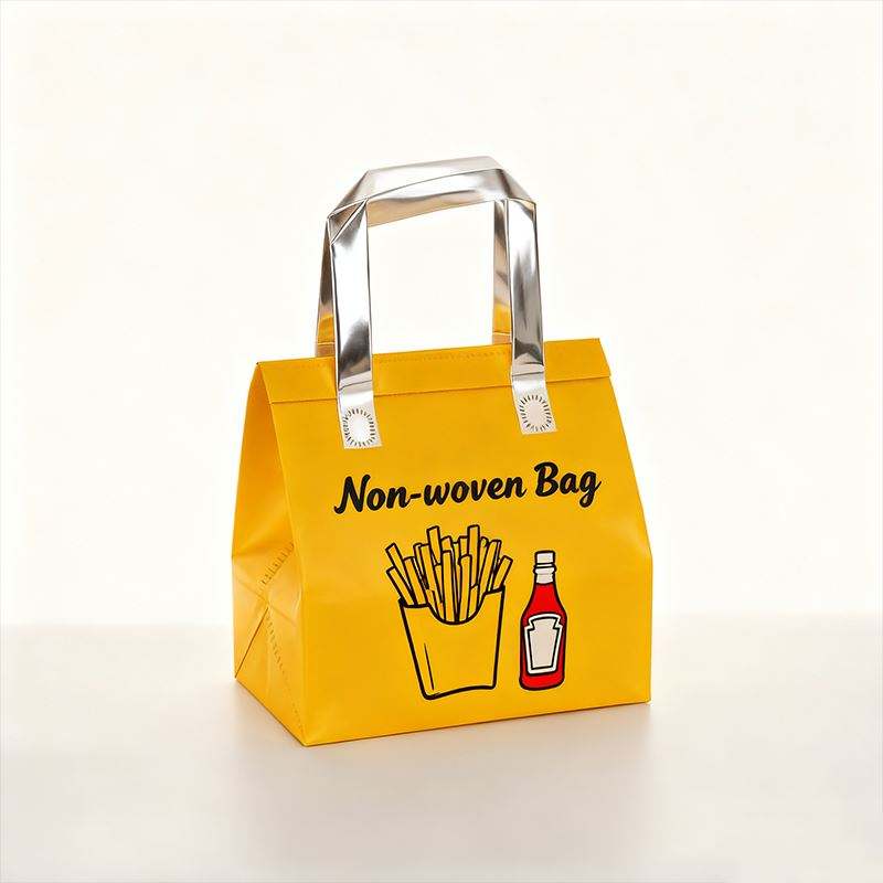 ถุงผ้าสปันบอนด์สีเหลืองพิมพ์ลายเฟรนช์ฟรายส์และซอสมะเขือเทศ เป็นมิตรกับสิ่งแวดล้อม สำหรับส่งอาหารจานด่วน เค้ก และแซนด์วิช ดีไซน์สะดุดตา สร้างแบรนด์ให้โดดเด่น