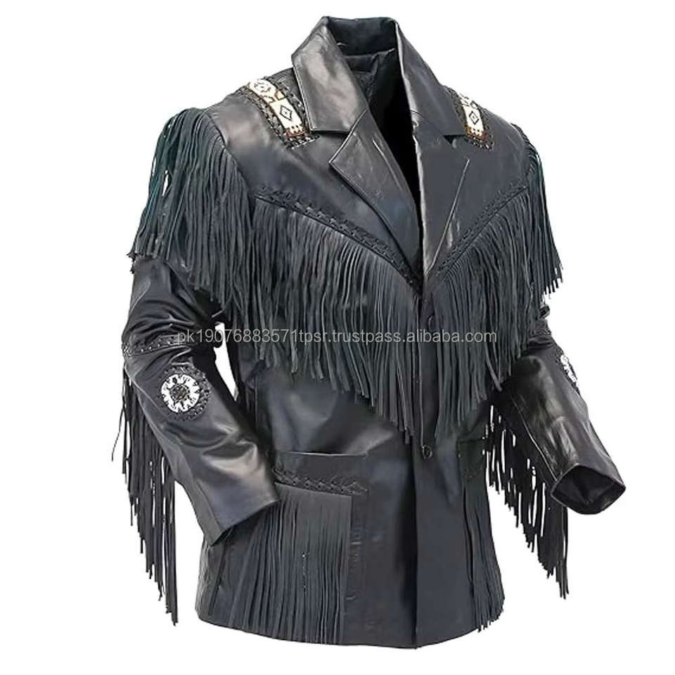 แจ็คเก็ตหนังวัวแท้สไตล์คาวบอยประดับพู่และลูกปัดสำหรับผู้ชาย แจ็คเก็ตคาวบอยสวยงามสำหรับผู้ชาย