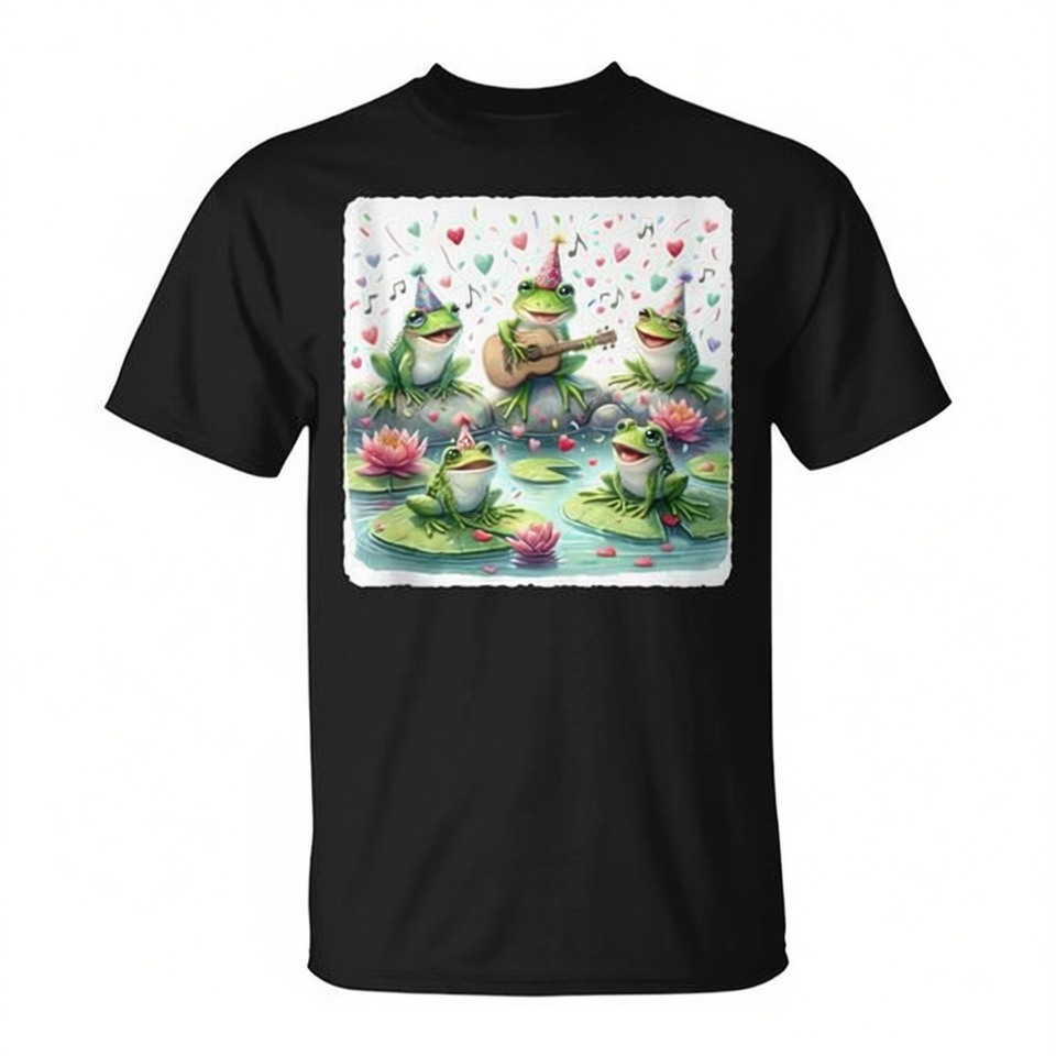 เสื้อยืดลายกบเฉลิมฉลองบนดอกบัวพร้อมลูกปาสีดำสำหรับผู้ใหญ่แบบยูนิเซ็กส์