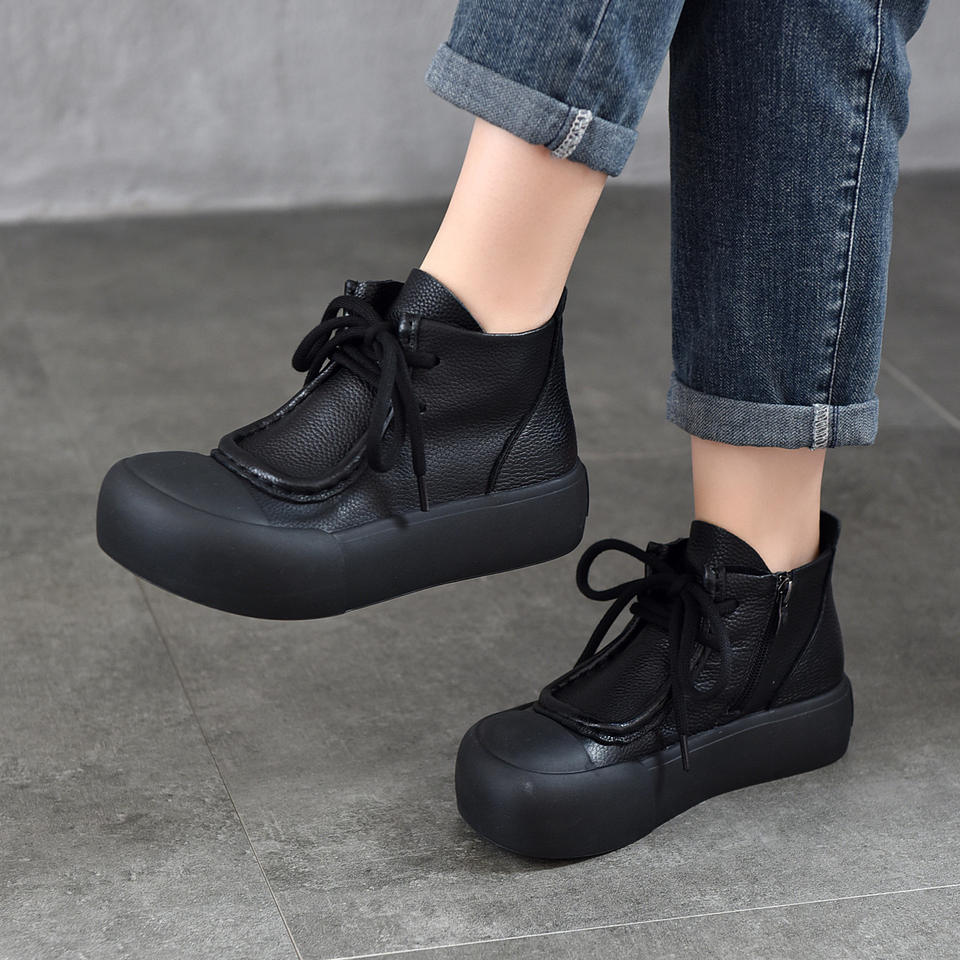 รองเท้าบูทผู้หญิงแบบผูกเชือกด้านหน้า สไตล์พื้นหนา รองเท้าบูทลำลองแบบมีซิปด้านใน รองเท้าบูทหุ้มข้อผู้หญิง รองเท้าบูทแบบซ่อนส้น