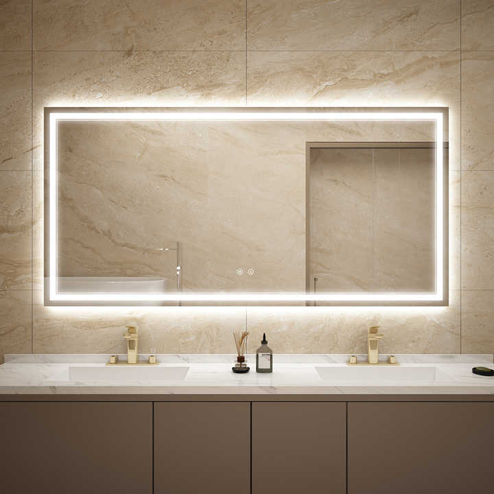 กระจกห้องน้ำ LED ทรงสี่เหลี่ยมมีไฟด้านหลังเป็นฝ้าสำหรับใช้ในห้องน้ำดีไซน์อัจฉริยะไม่มีกรอบกันหมอก