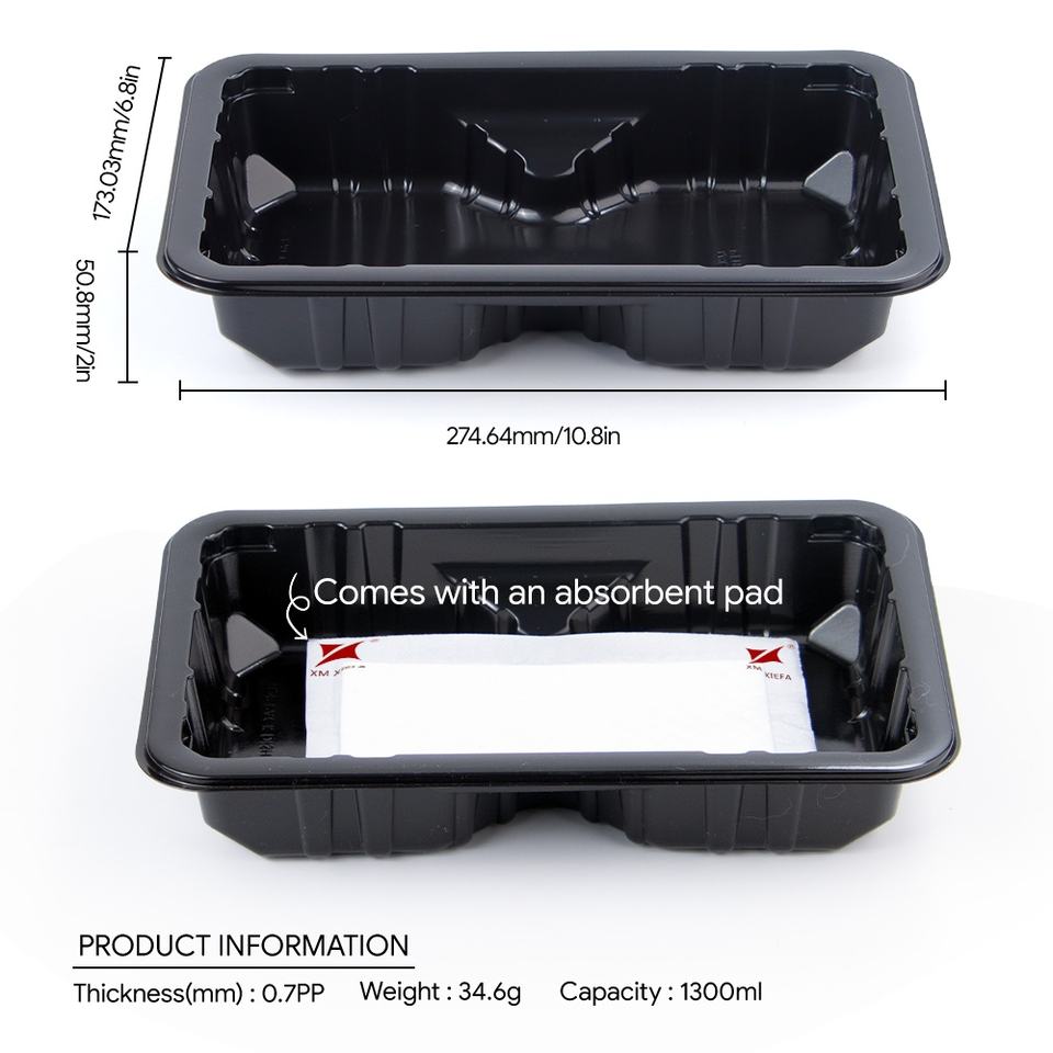 ถาดบรรจุภัณฑ์อาหารแช่แข็ง ถาดพลาสติก PP สีดำแบบใช้แล้วทิ้งสำหรับเนื้อสัตว์ กระบวนการผลิตแบบ Blister ปรับแต่งได้ตามแบรนด์ สำหรับซุปเปอร์มาร์เก็ต