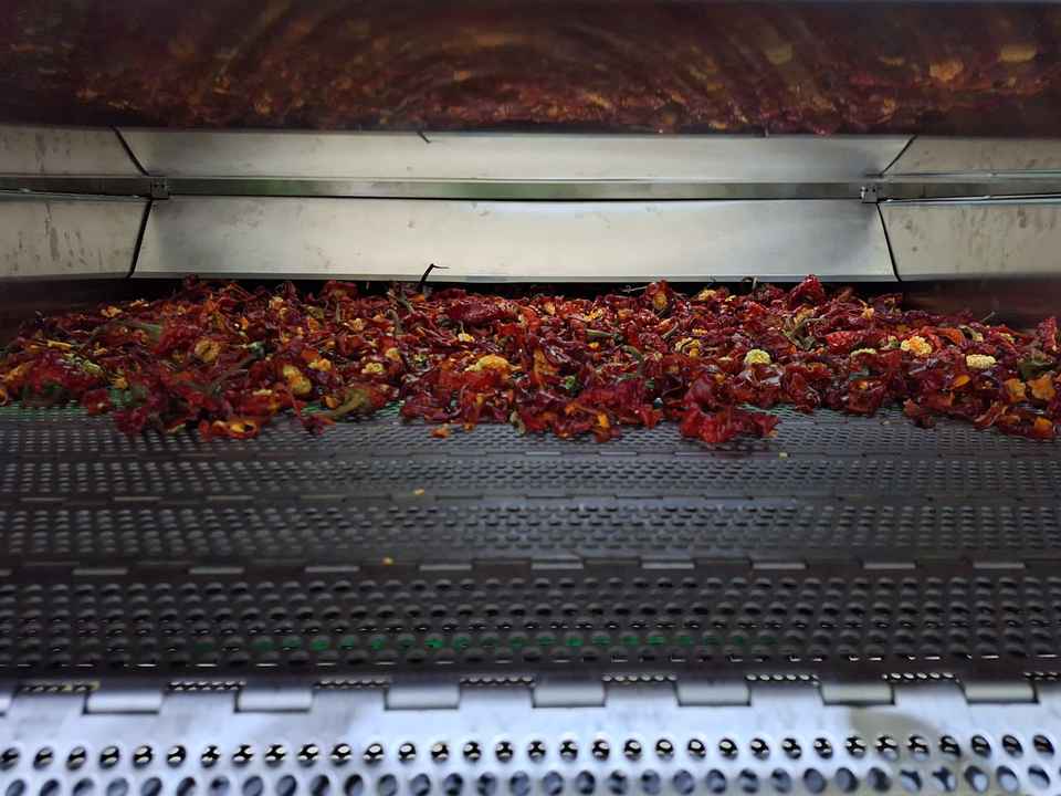 เครื่องอบแห้งผลไม้ ถั่ว ผัก พริกป่น พริกแดง แบบต่อเนื่อง 3 ชั้น ระบบสายพาน ควบคุมด้วย PLC ใช้แก๊ส รุ่นใหม่