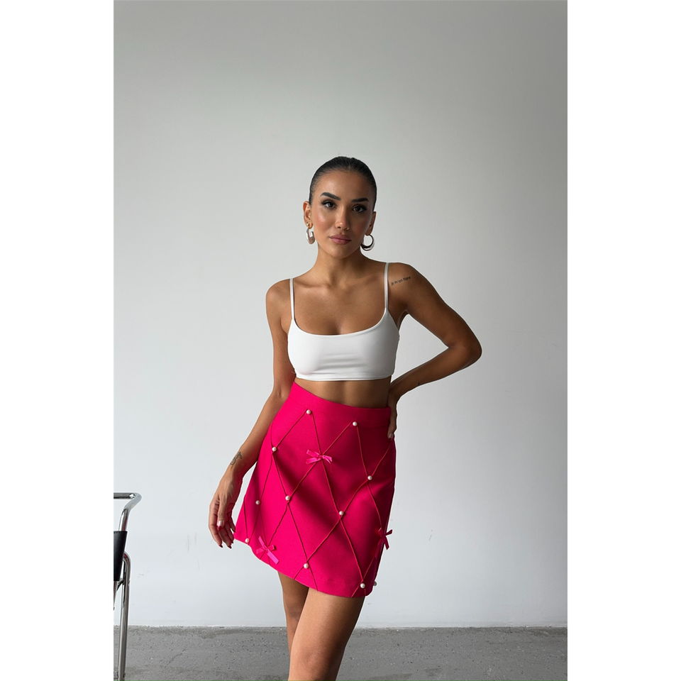 กระโปรงทรงดินสอผ้าลินินสีบานเย็นพร้อมดีไซน์ลายปักแบบผ้าพันแผล กระโปรงหนังสั้นประดับริบบิ้นมุกพร้อมลายปักตกแต่ง