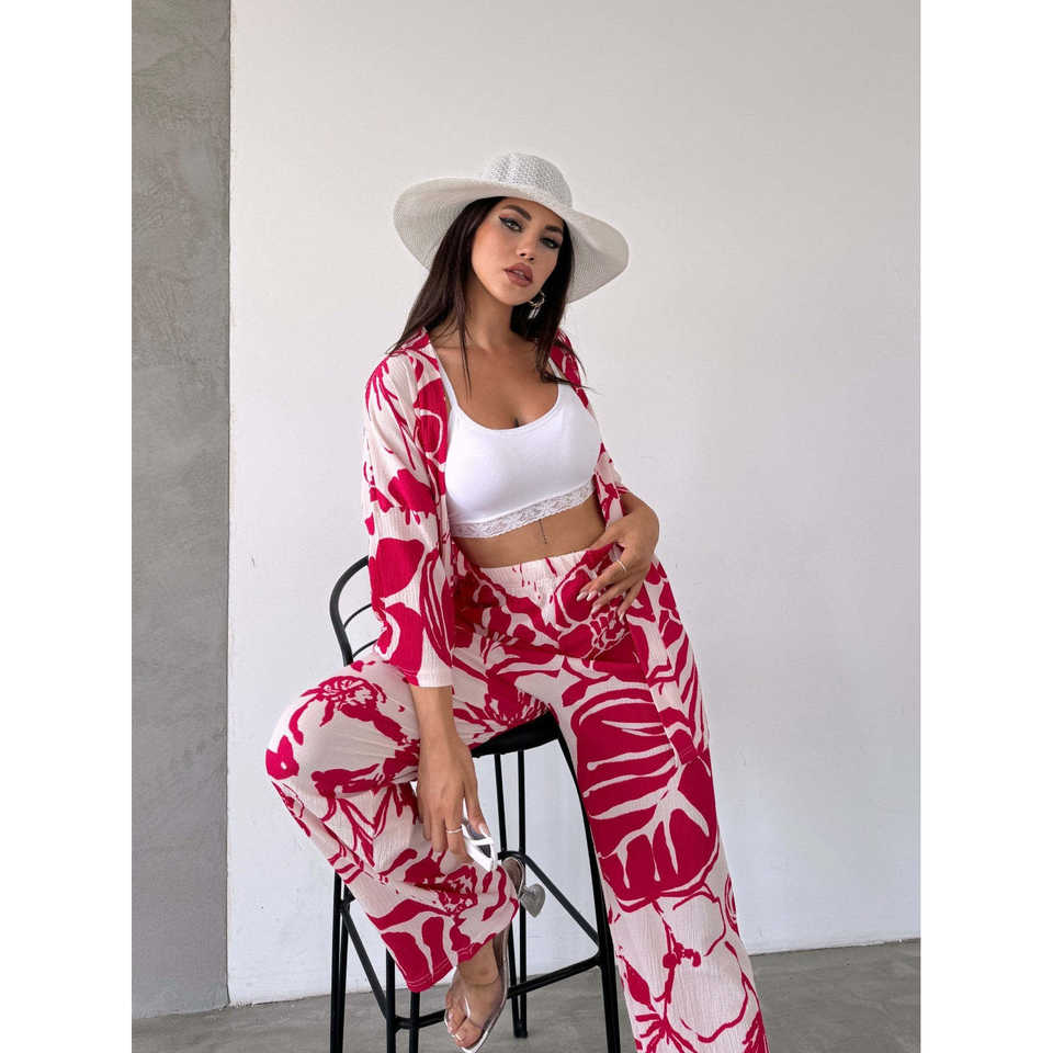 ชุดกิโมโนและกางเกงลายสีบานเย็นสำหรับผู้หญิง ผ้าชีฟองสไตล์โบฮีเมียน สำหรับฤดูใบไม้ผลิและฤดูร้อน ระบายอากาศได้ดี แขนสามส่วน