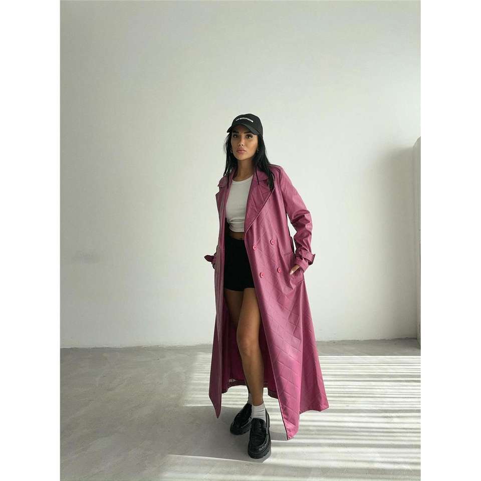เสื้อโค้ทหนังเย็บลายสีชมพูบานเย็นสำหรับผู้หญิง สไตล์ลำลอง บุด้วยผ้าฝ้าย หนังแท้ ปิดด้วยเข็มขัด ผ้าเดนิมถัก สำหรับฤดูหนาว