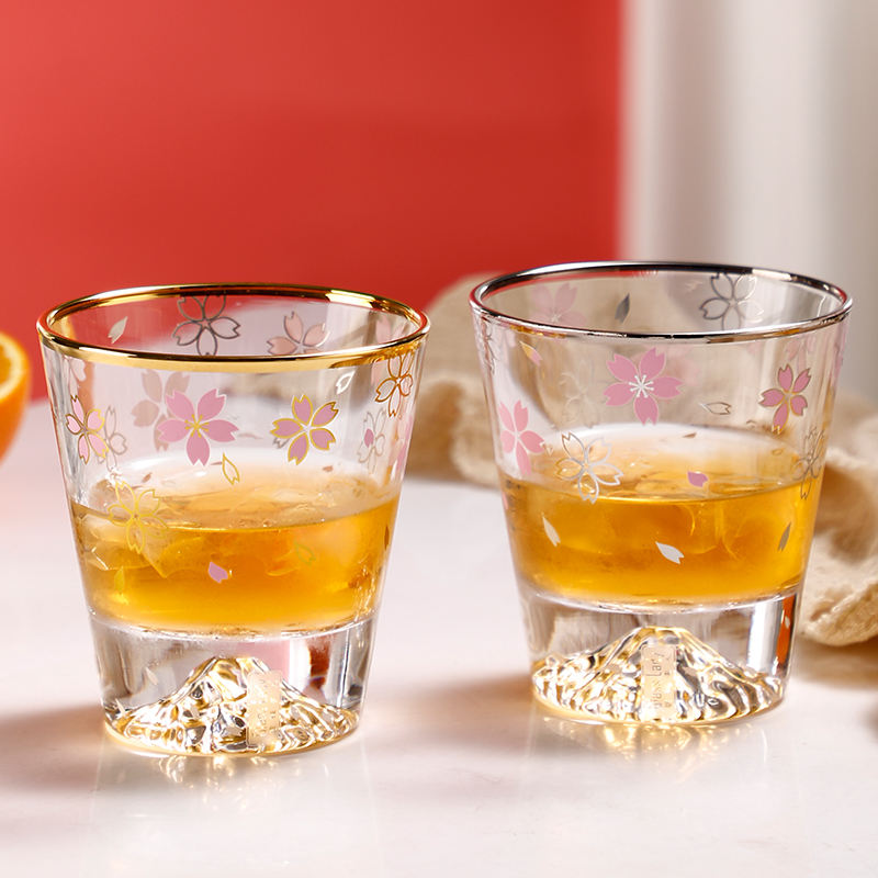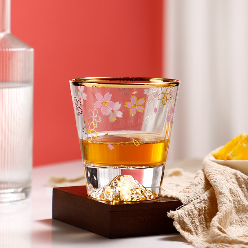 Fujiyama Cherry Blossom Porcelain Crystal Shot Glass Custom Whisky Cup with Golden Rim and Phnom Penh Decanter 65ml