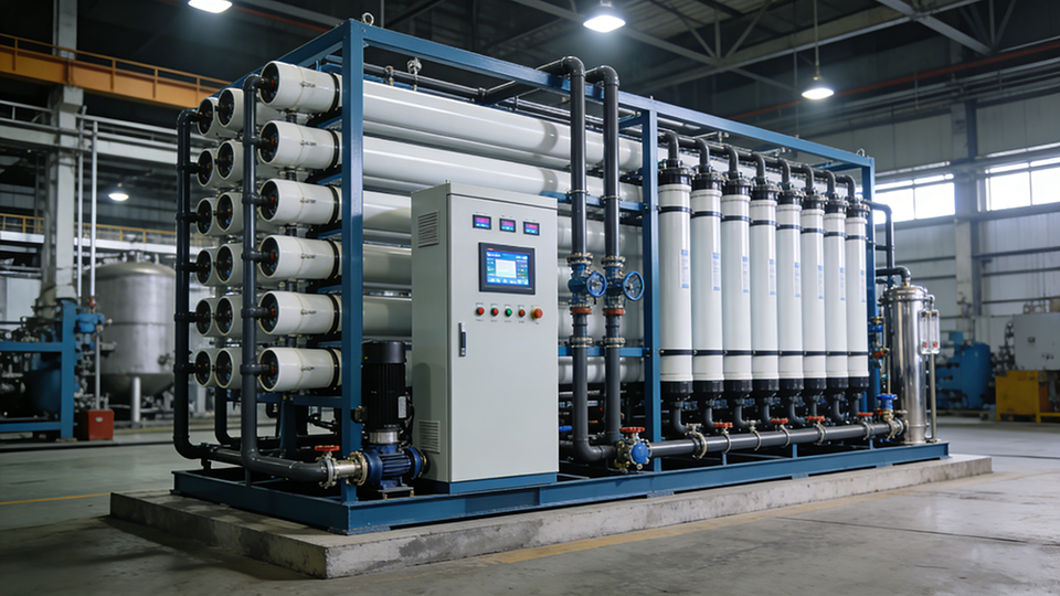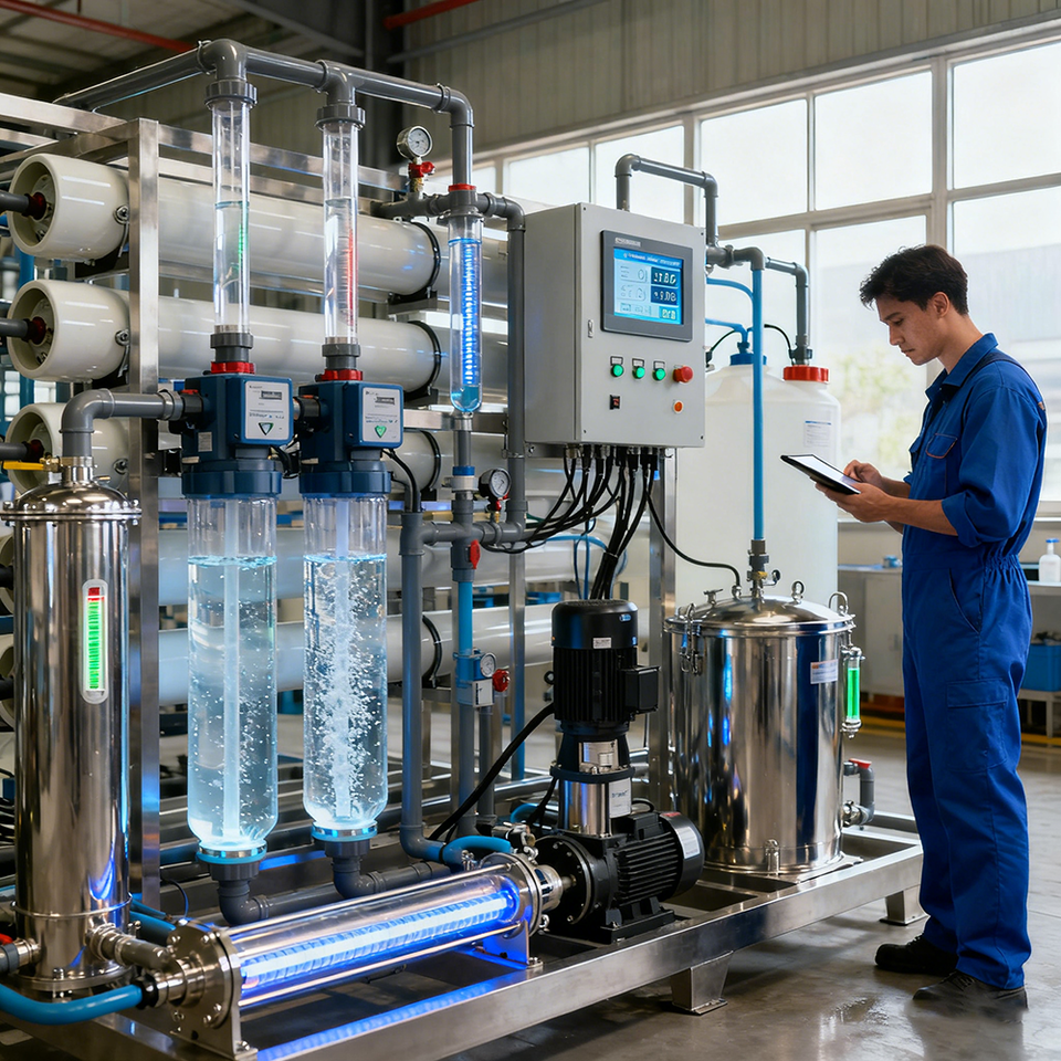 เครื่องกรองน้ำระบบ Reverse Osmosis (RO) ควบคุมด้วย PLC อัตโนมัติเต็มรูปแบบ พร้อมปั๊มน้ำ 1000 ลิตร/ชั่วโมง และระบบตรวจสอบคุณภาพน้ำออนไลน์