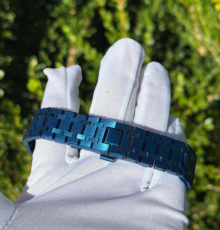 หน้าปัดกระจกสีรุ้งสีฟ้าแบบเต็มเคสที่กำหนดเองนาฬิกาผู้ชาย MOD พรีเมี่ยมของขวัญสำหรับผู้ชายนาฬิกาที่กำหนดเอง