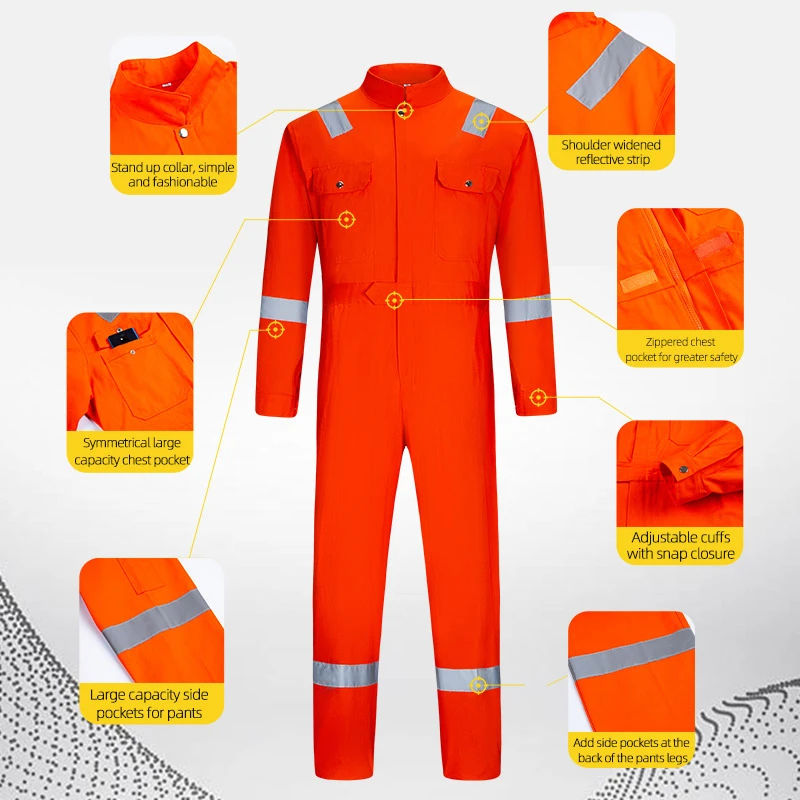 ชุดคลุมป้องกันเปลวไฟทั้งตัว ระบายอากาศได้ดี ผลิตจากผ้าฝ้าย ได้รับการรับรองมาตรฐาน EN ชุดป้องกันการมองเห็นได้ชัดเจน เหมาะสำหรับช่างสายไฟ ช่างในโรงกลั่น และพนักงานโรงงาน