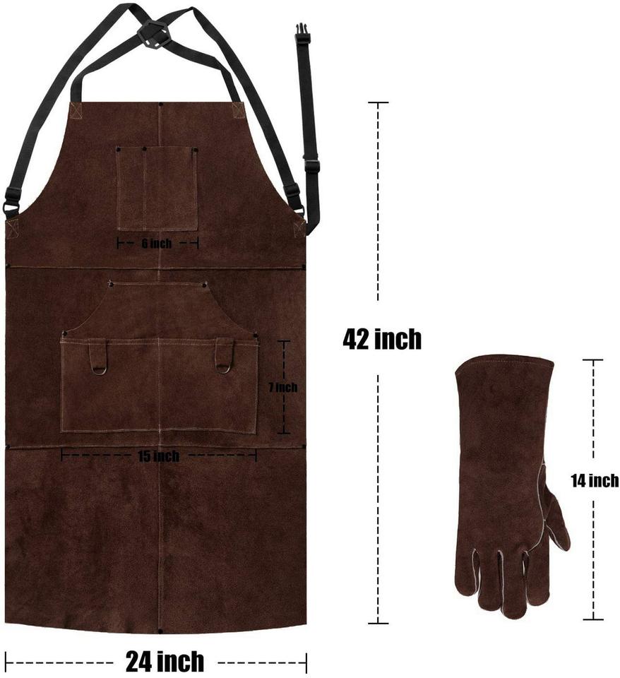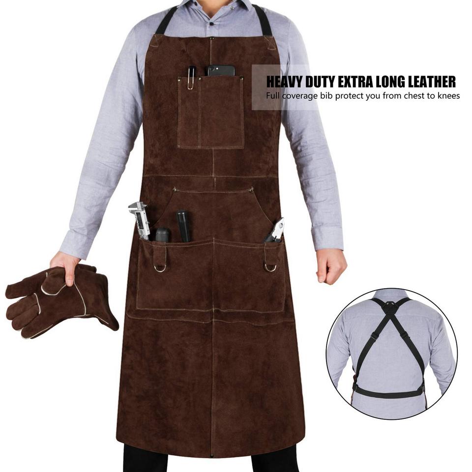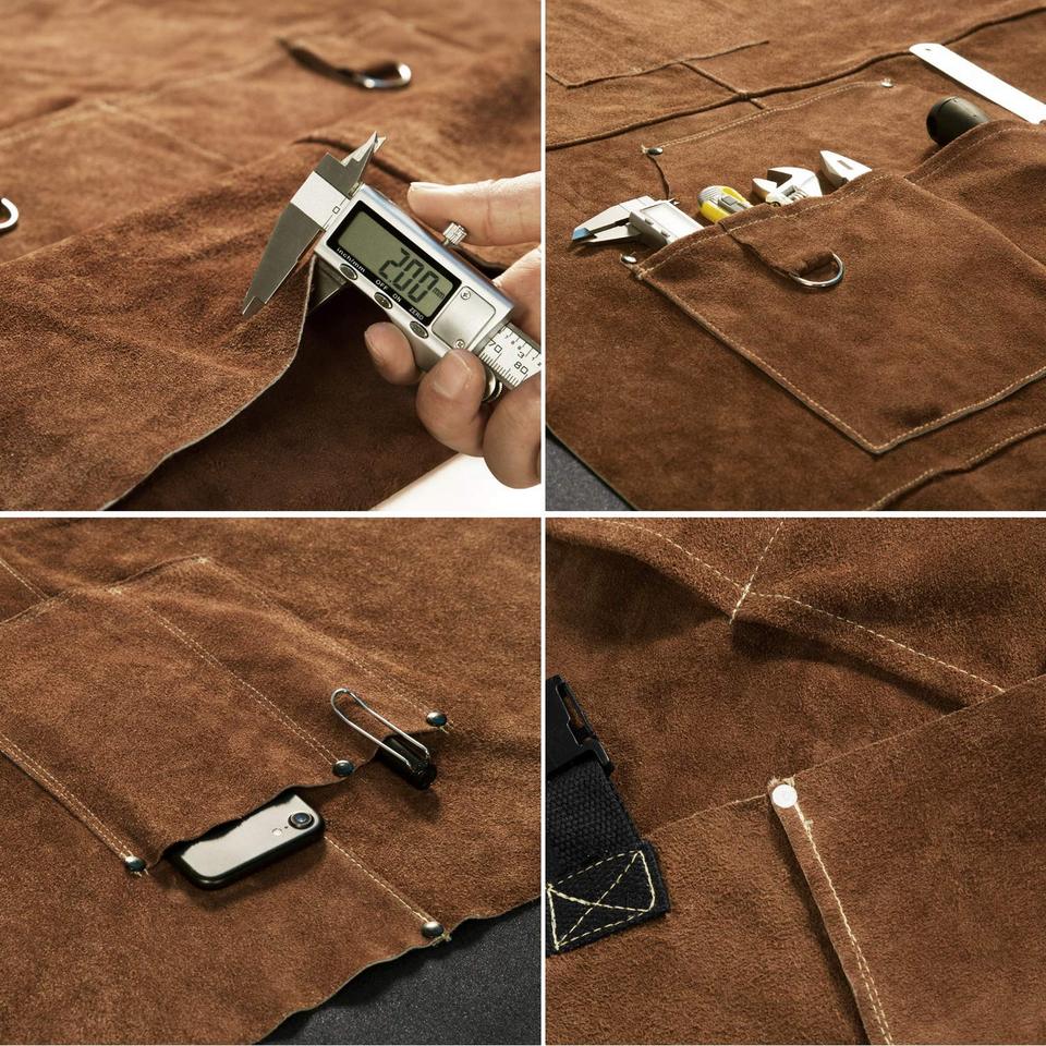 ผ้ากันเปื้อนงานเชื่อมหนังวัวเต็มตัวผ้ากันเปื้อนกันไฟและทนความร้อนปรับได้มี6ช่องสำหรับงานเชื่อมบาร์บีคิว