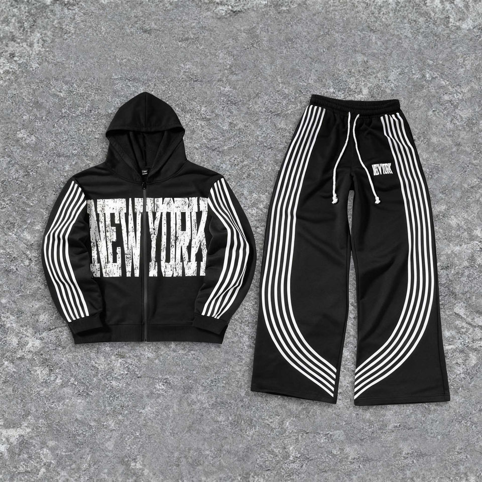 ชุดสตรีทแวร์แบบสั่งทำพิเศษสำหรับผู้ชาย ชุดสองชิ้น ลายทาง ผ้าฝ้ายหวี 100% เป็นมิตรกับสิ่งแวดล้อม กางเกงขาบาน เสื้อฮู้ดดี้ ชุดวอร์มสำหรับผู้ชาย