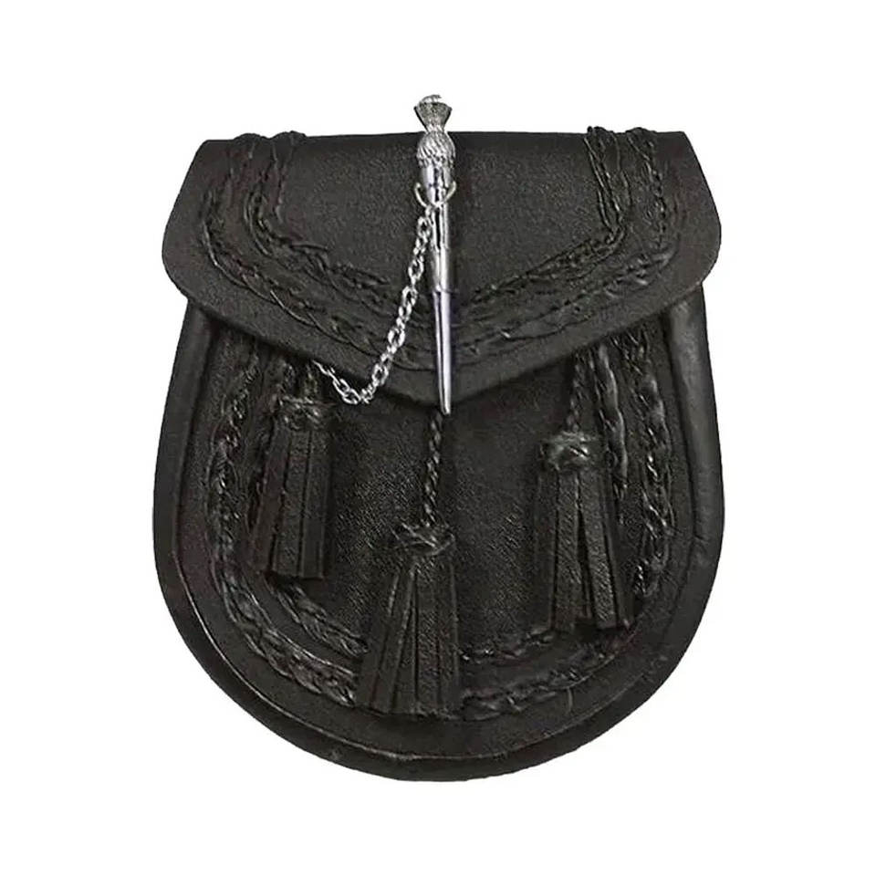 Sporran หนังแบบปรับแต่งได้เต็มรูปแบบพร้อมพู่โซ่3เส้นพร้อมสายรัด sporran และกระเป๋า sporrans ทรงสูง