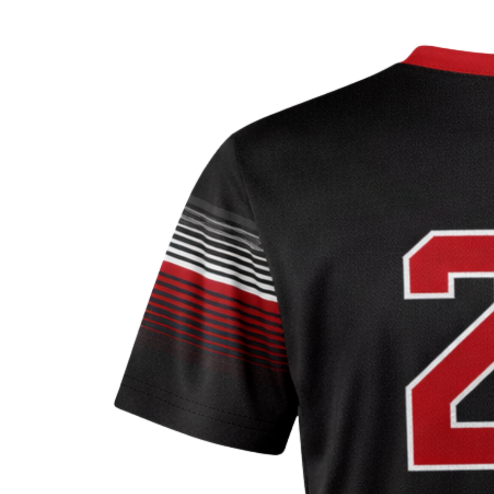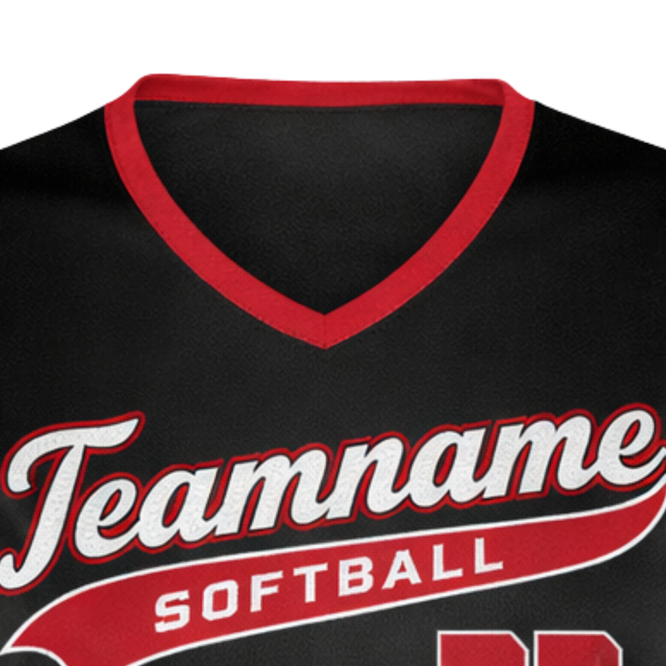 เสื้อซอฟต์บอลแบบซับลิเมชั่นเต็มตัว สีดำไล่เฉดแดง คอวี ชุดทีมแบบกำหนดเองพร้อมหมายเลขด้านหลัง ทรงแอธเลติก