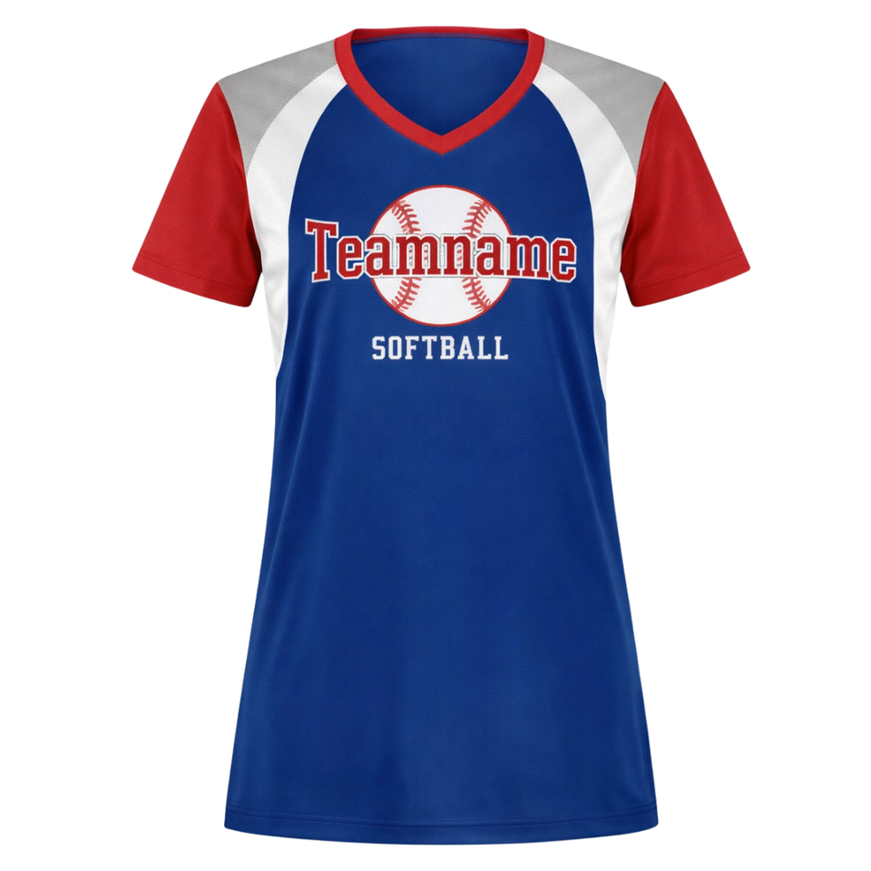เสื้อซอฟต์บอลแบบพิมพ์ลายเต็มตัว สีน้ำเงินกรมท่า แดง เทา คอวี ชุดทีมแบบกำหนดเองพร้อมหมายเลขด้านหลัง