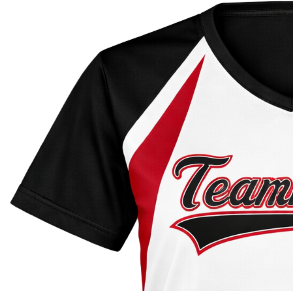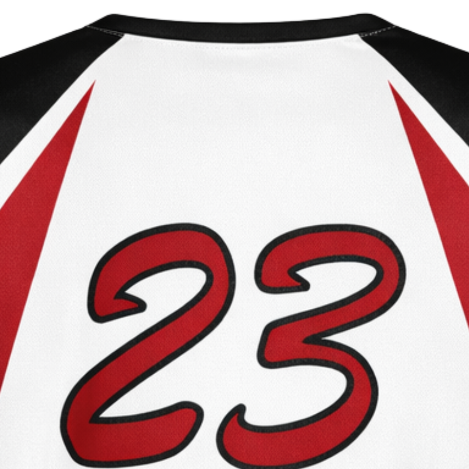เสื้อซอฟต์บอลแบบพิมพ์ลายเต็มตัว สีขาว ดำ แดงไล่เฉด คอวี ชุดทีมสั่งทำพิเศษ พร้อมพิมพ์หมายเลขด้านหลัง