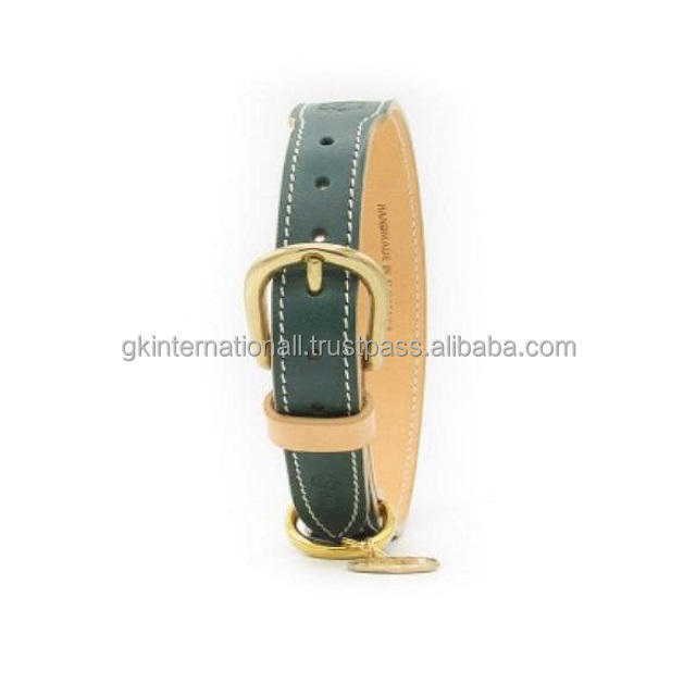 ปลอกคอหนังสำหรับสุนัขลายไม้แบบกำหนดเองได้,การเย็บขอบสีเขียวแบบเต็มลายพร้อมหัวเข็มขัดตกแต่งด้วยทองเหลืองแหวน D และหมุดโลหะ