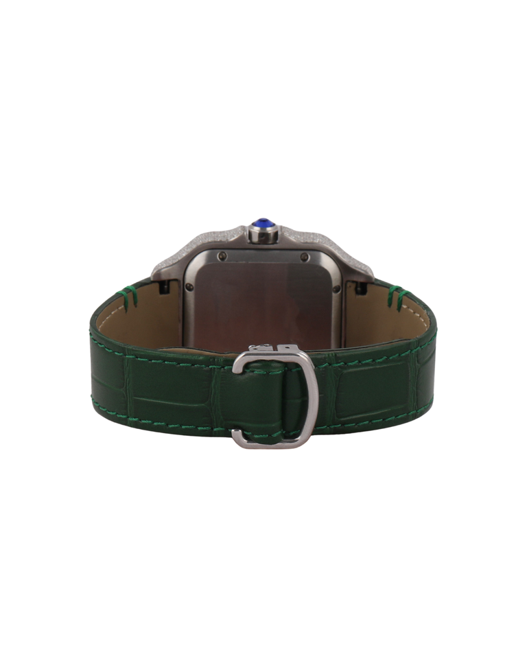 นาฬิกาเพชรโมอิสซาไนต์ทรงกลมชุบทองคำขาวแบบเต็มหน้าปัด ประดับเพชรเต็มวง สายสีเขียวคลาสสิก เหมาะสำหรับเป็นของขวัญสำหรับผู้ชาย