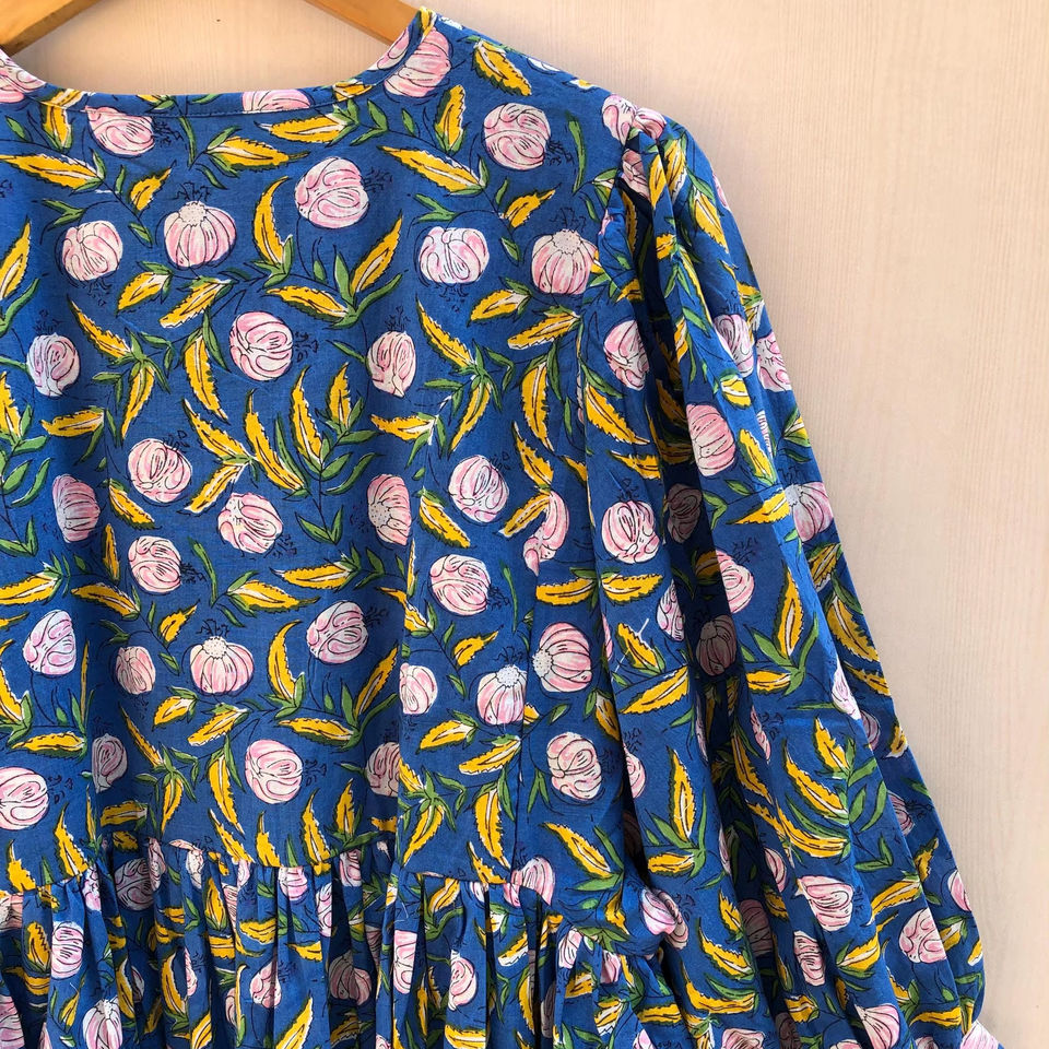 ชุดลำลองคอวีแบบยาว ปิดด้วยเชือกผูก ลายดอกไม้พิมพ์บล็อก แขนยาวทรงหลวม เอวธรรมชาติ ผ้าฝ้าย 100%