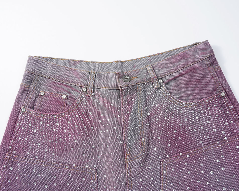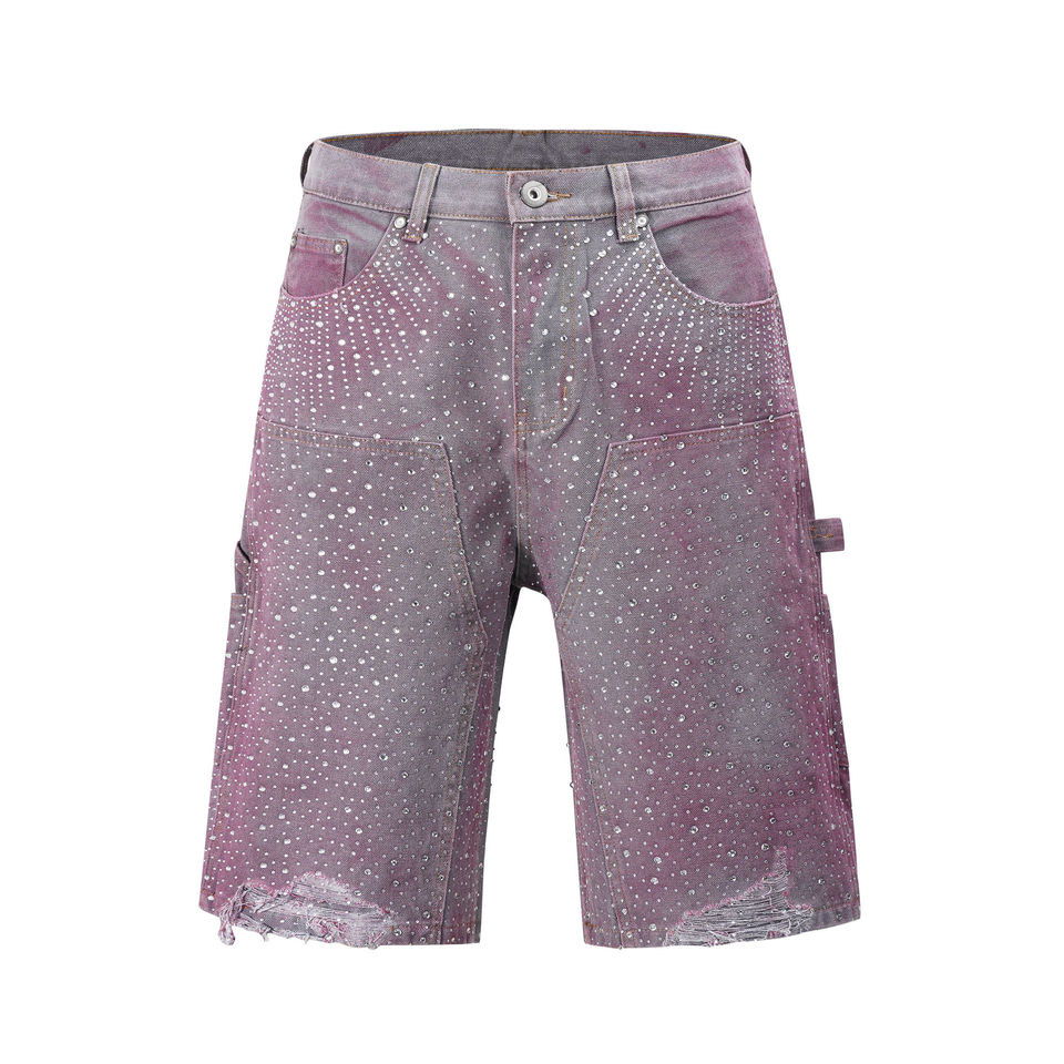 กางเกงยีนส์ขาสั้นผู้ชายผ้าฝ้าย 100% สไตล์ลำลองขายส่ง แต่งคริสตัลเต็มตัว ทรงหลวม สไตล์สตรีท ระบายอากาศได้ดี ความยาวระดับเข่า