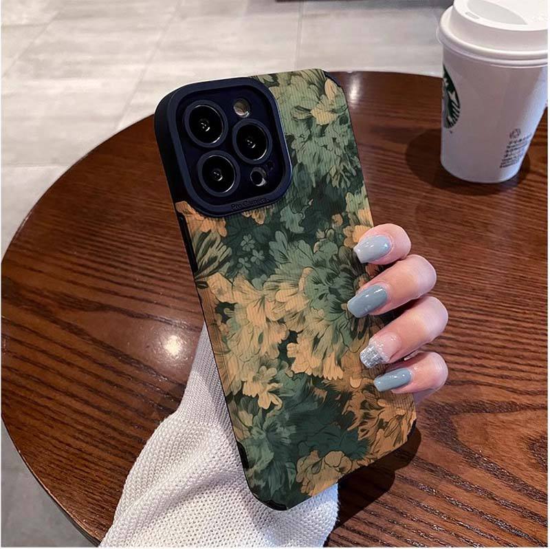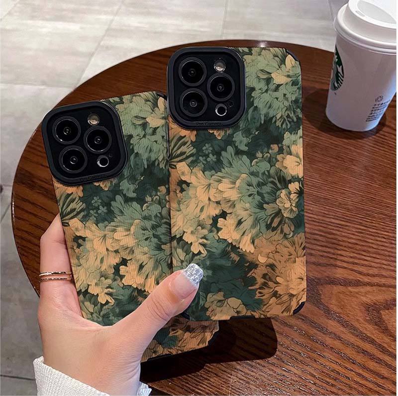 เคสโทรศัพท์มือถือหนังเทียม TPU พิมพ์ลายใบไม้สีเขียวแบบเต็มจอสำหรับ iPhone x XR XS 11 12 13 14 15 16 17 PRO MAX