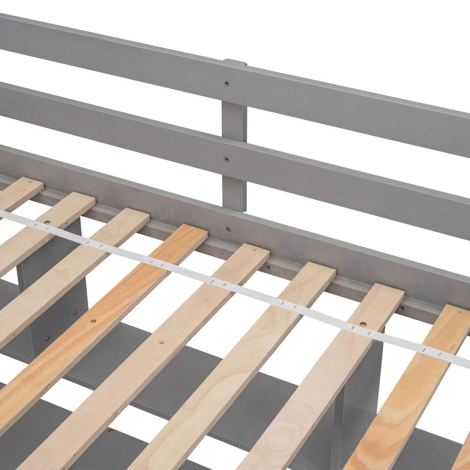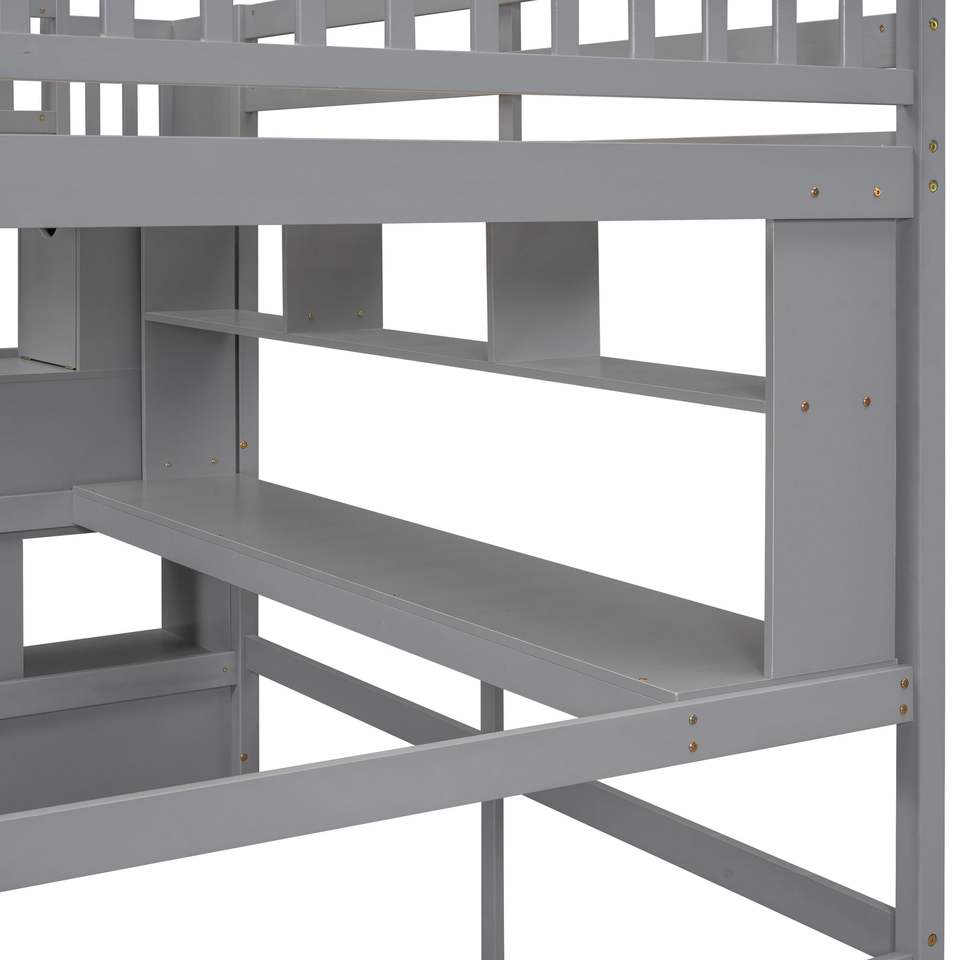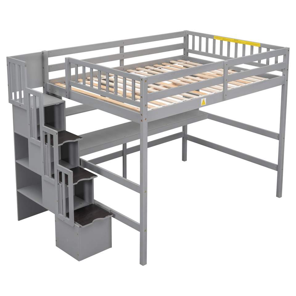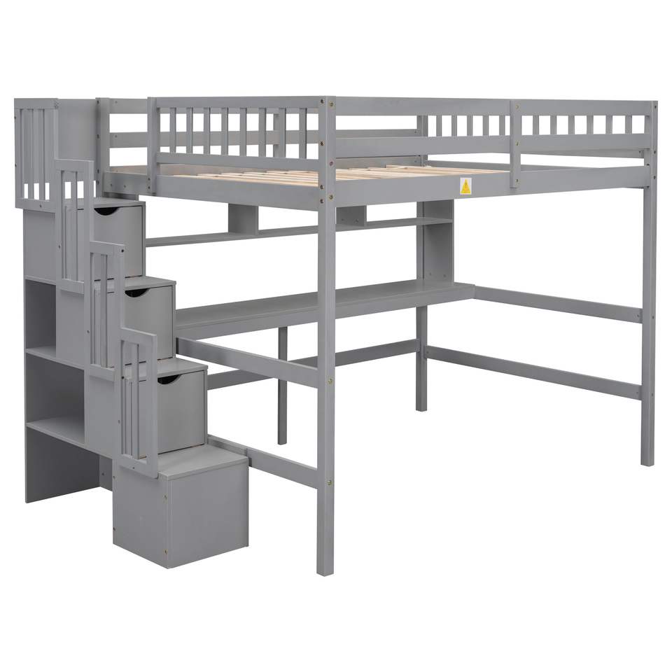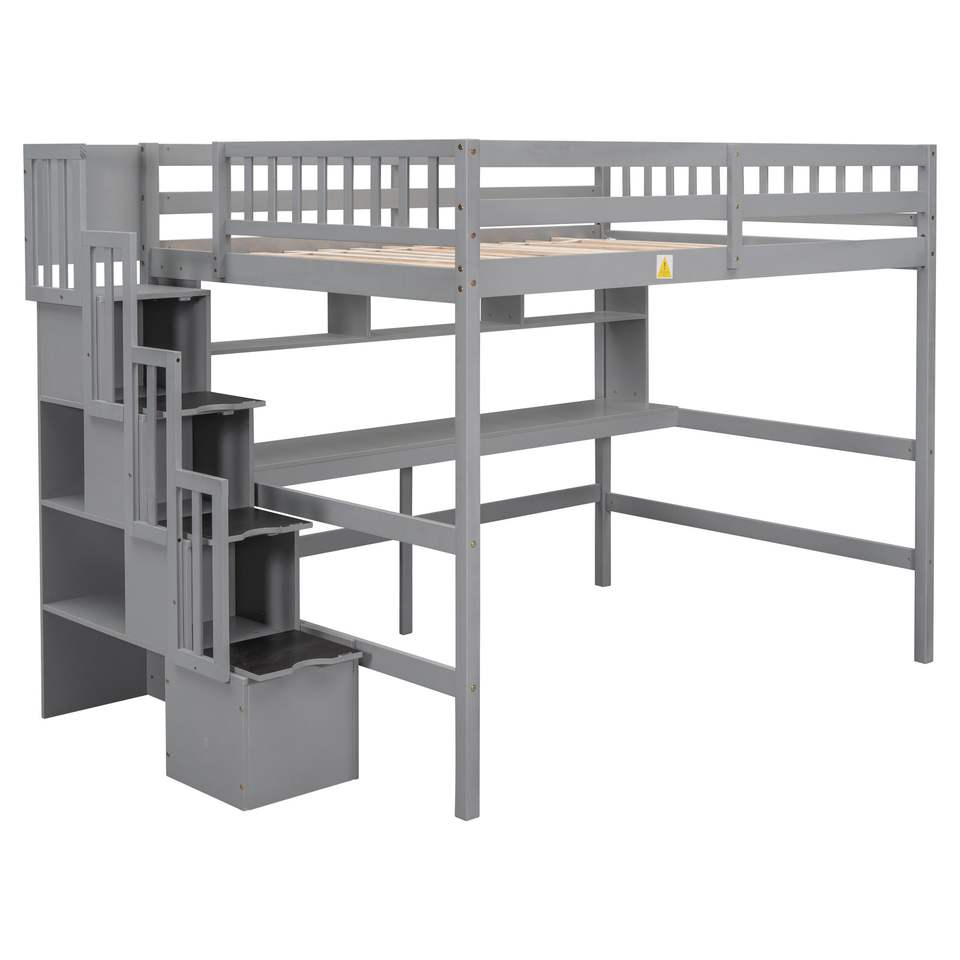 เตียงลอฟท์สีเทาขนาดใหญ่พร้อมโต๊ะทำงาน ชั้นวางของ และบันได